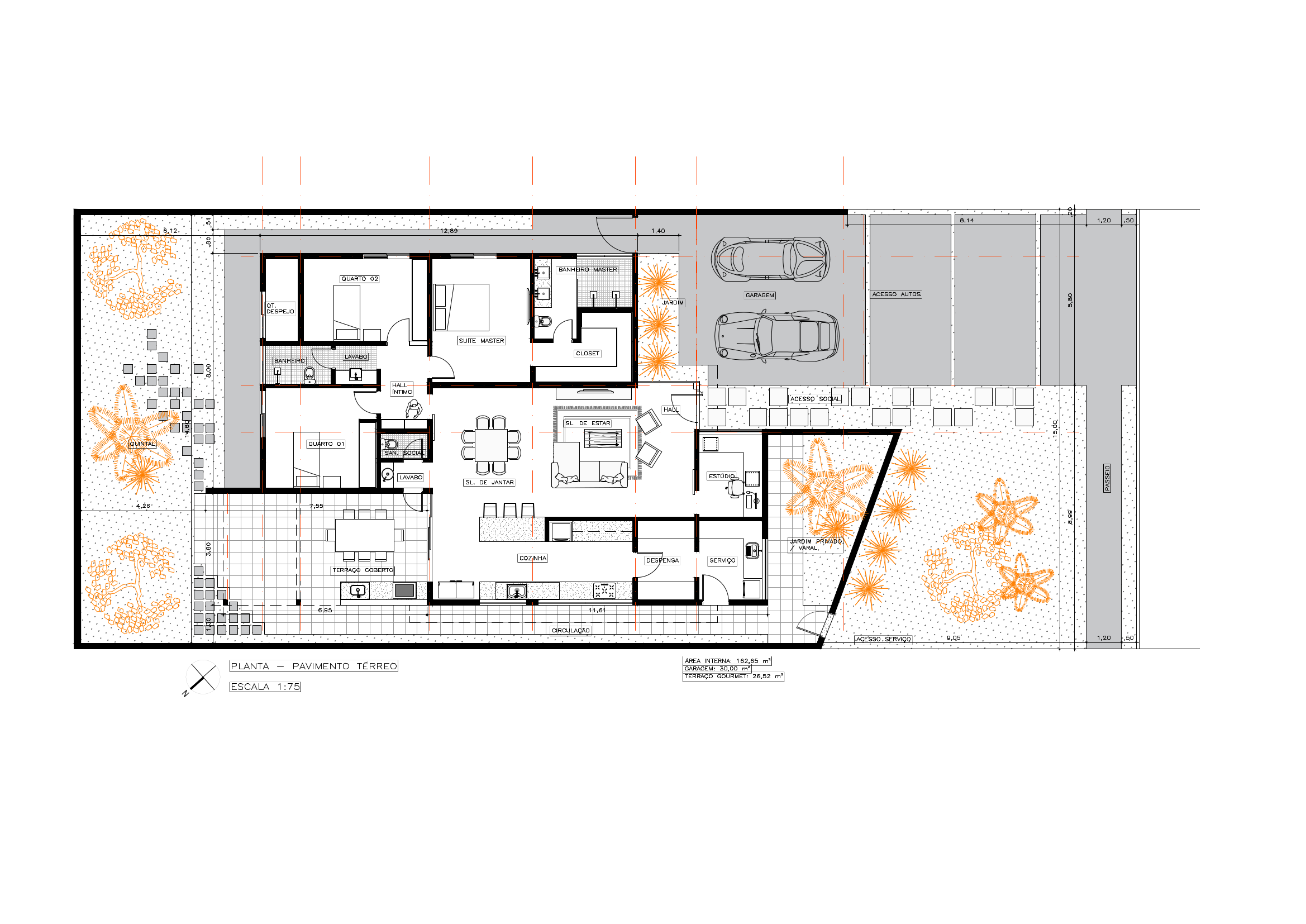 A presença desse telhado elevado em uma única água gera uma volumetria marcante para a fachada da casa, ao mesmo tempo que permite a entrada de luz e ventilação natural preservando a privacidade do ambiente de estar.