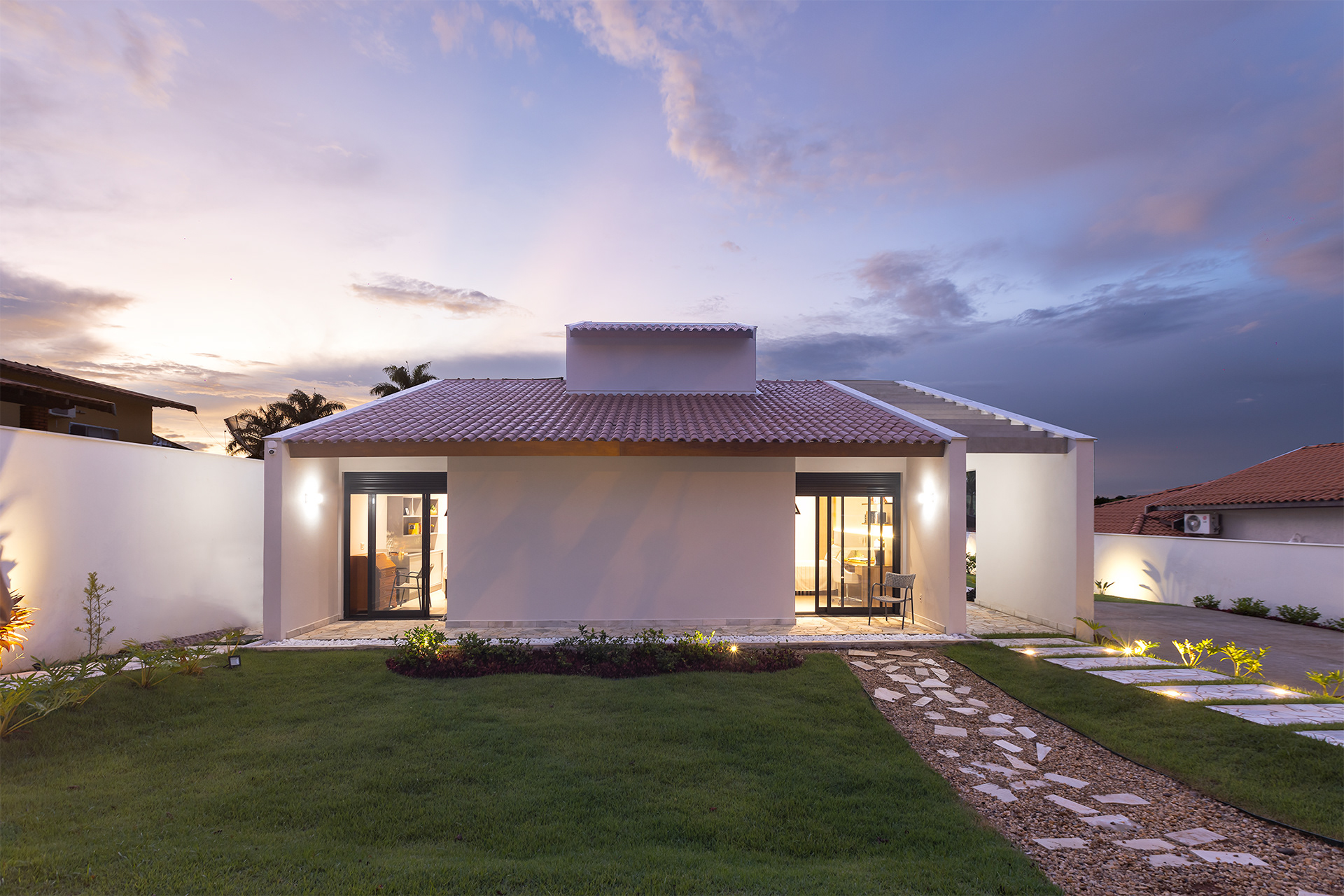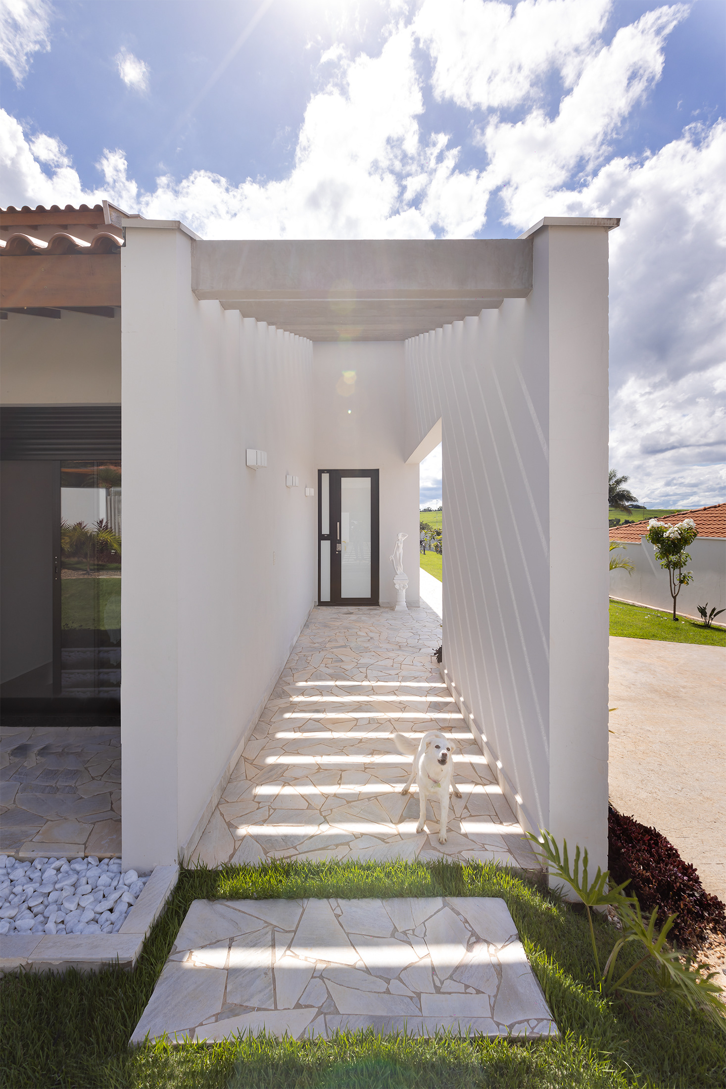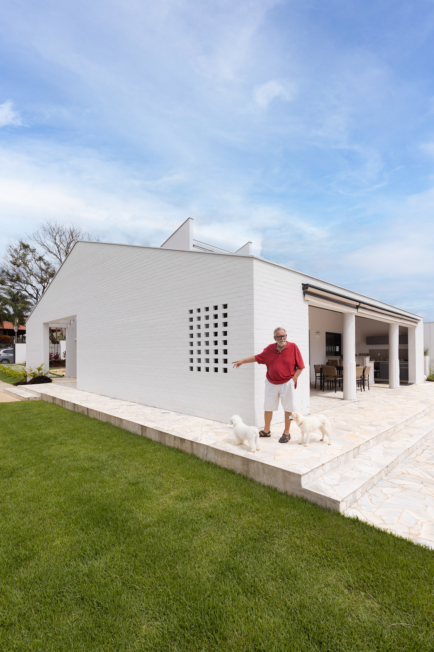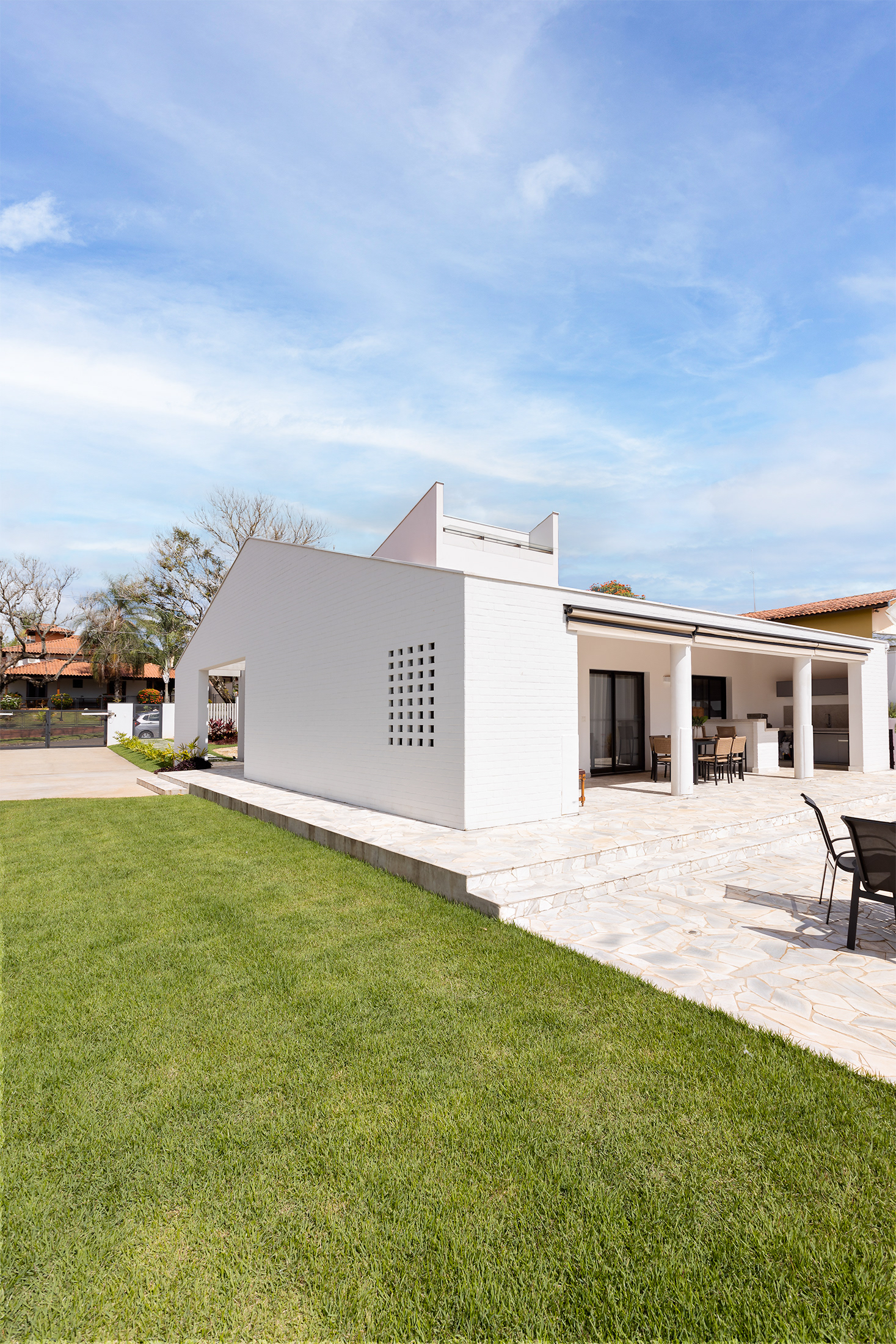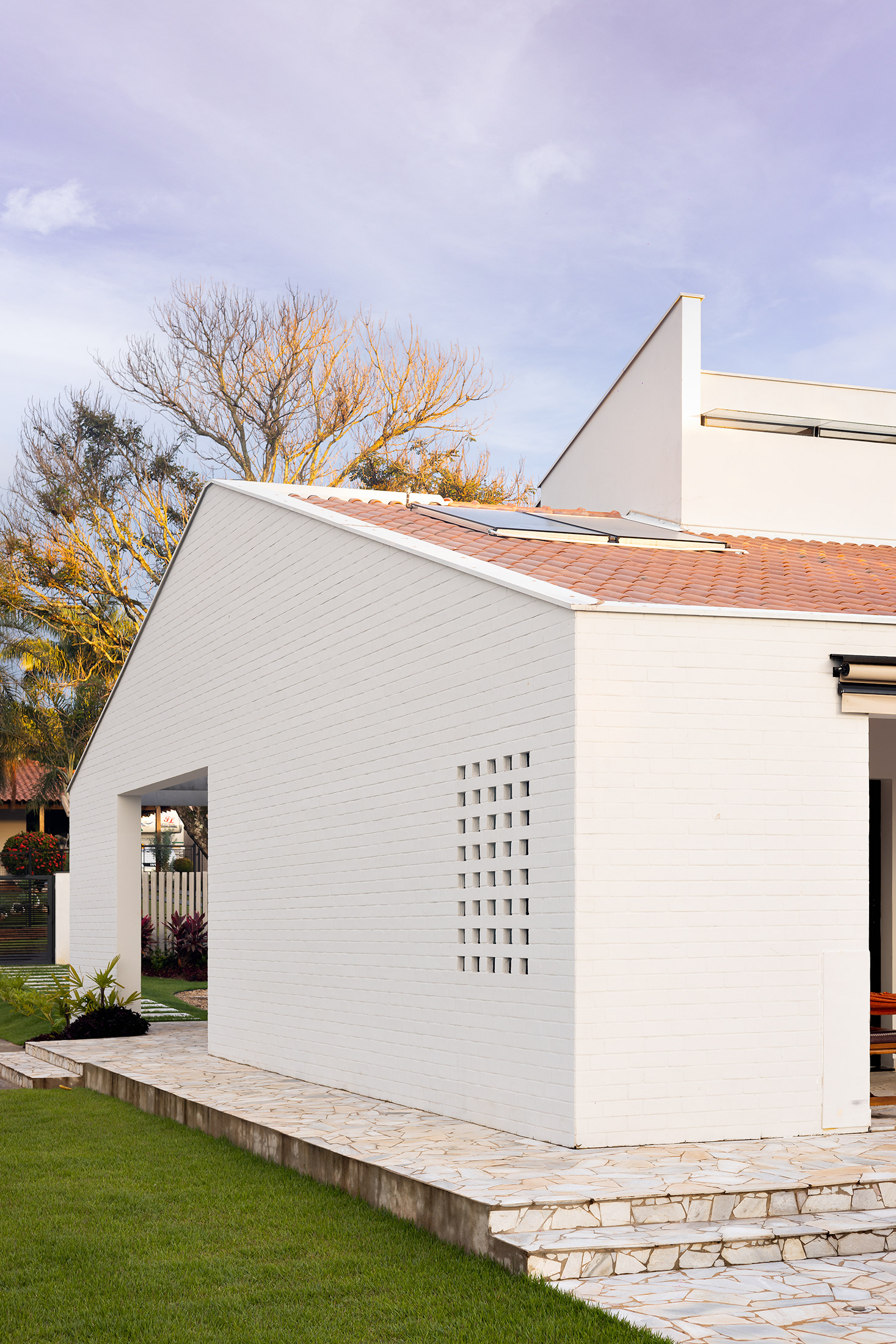 Casa térrea com inspirações campestres. O tijolo pintado, telhado cerâmico e a varanda contínua marcam presença, em uma livre referência às famosas “casas de rancho”, típicas do interior paulista.