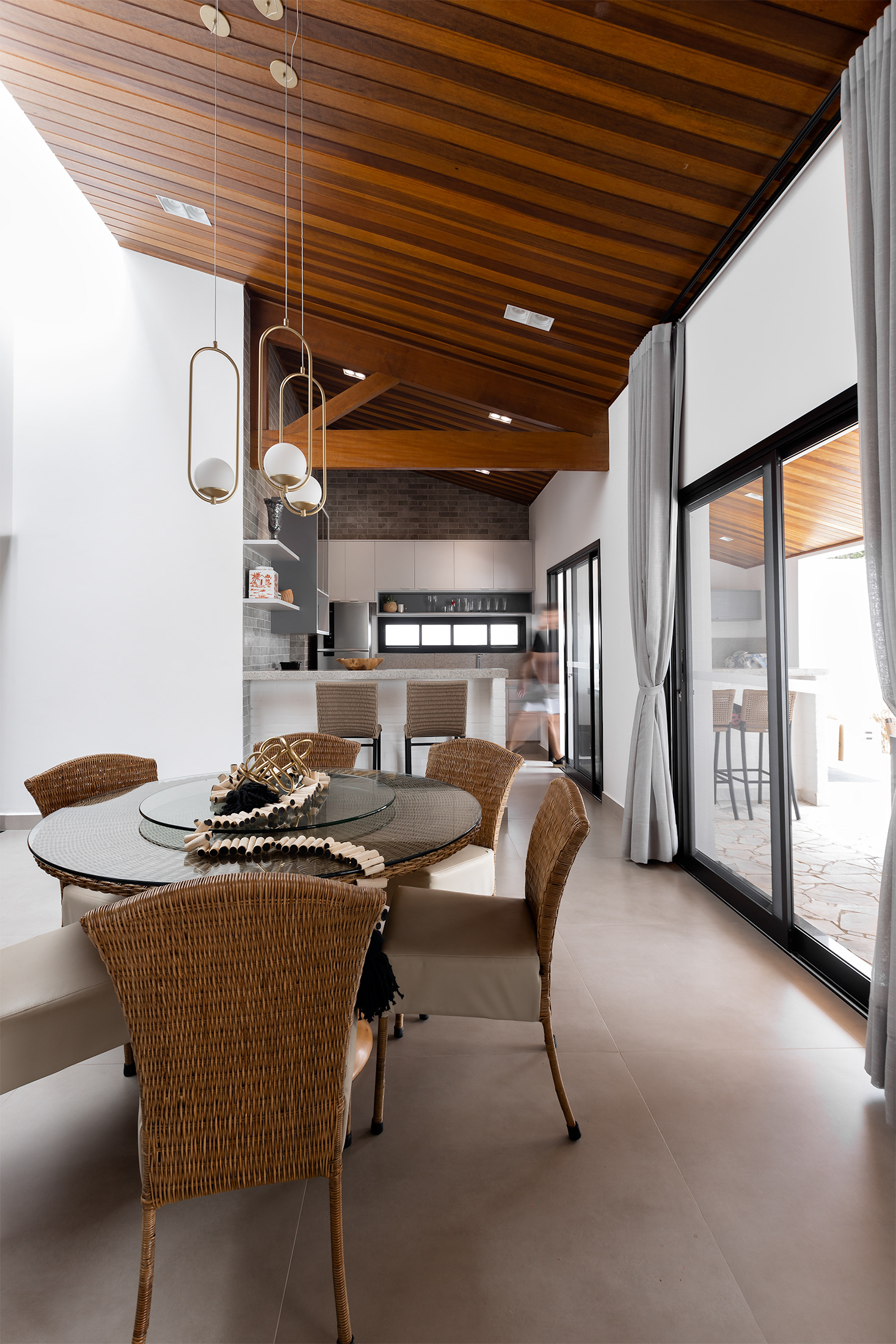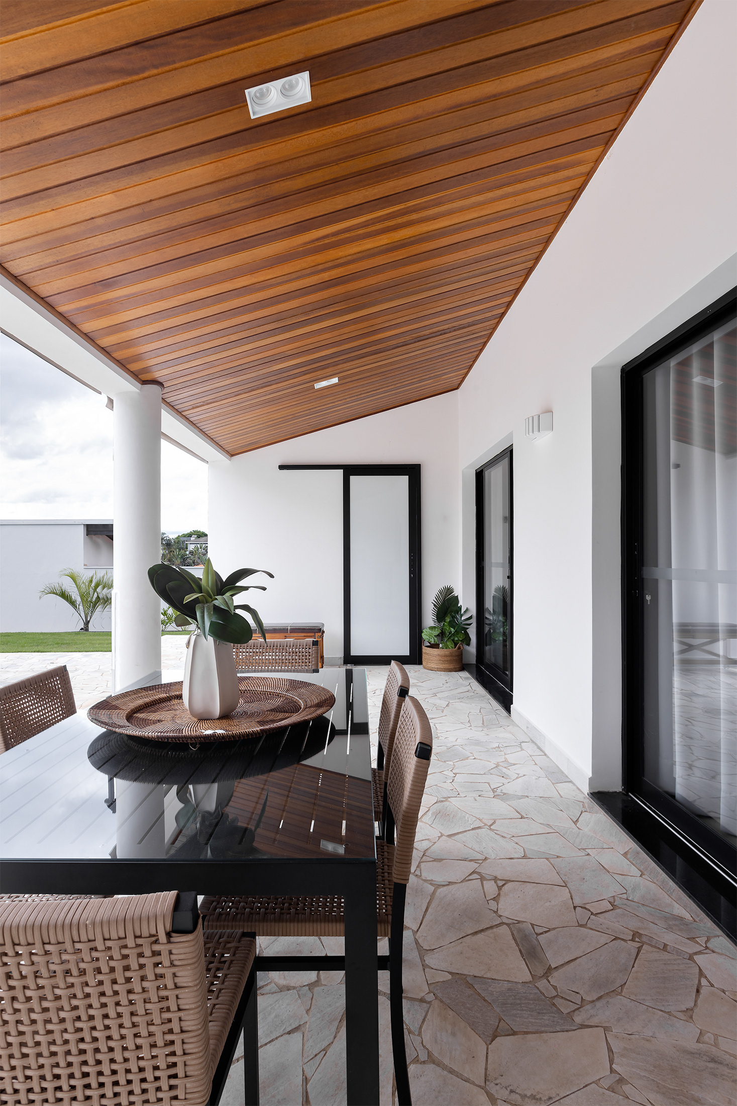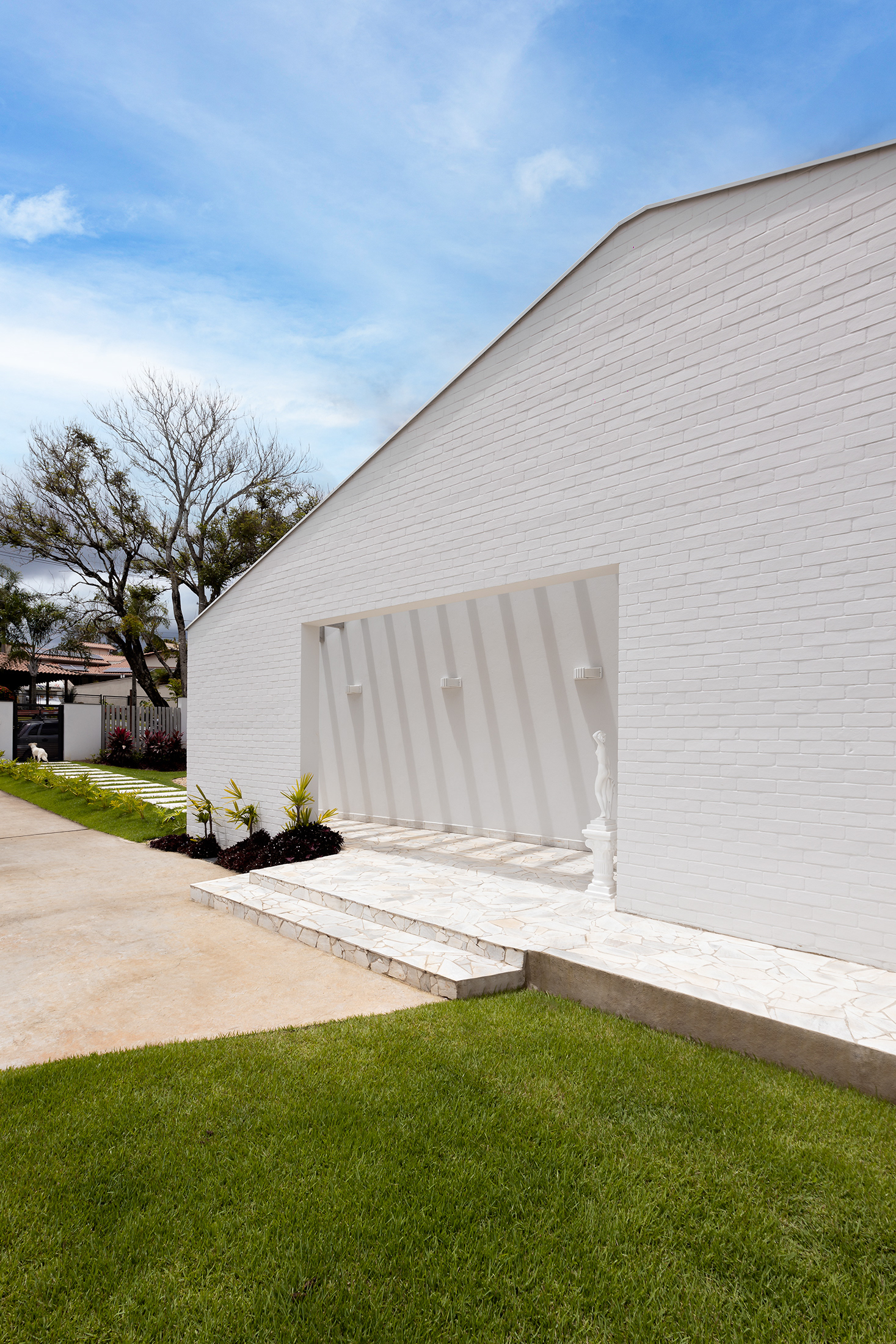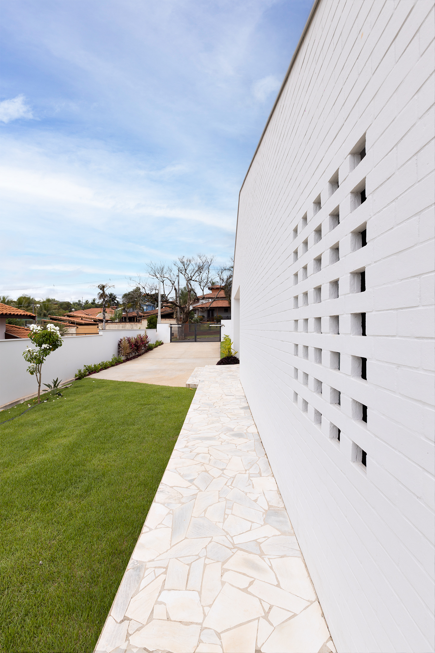Casa térrea com inspirações campestres. O tijolo pintado, telhado cerâmico e a varanda contínua marcam presença, em uma livre referência às famosas “casas de rancho”, típicas do interior paulista.
