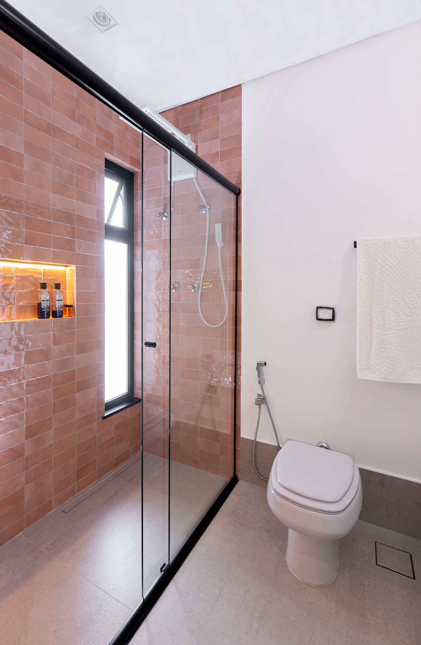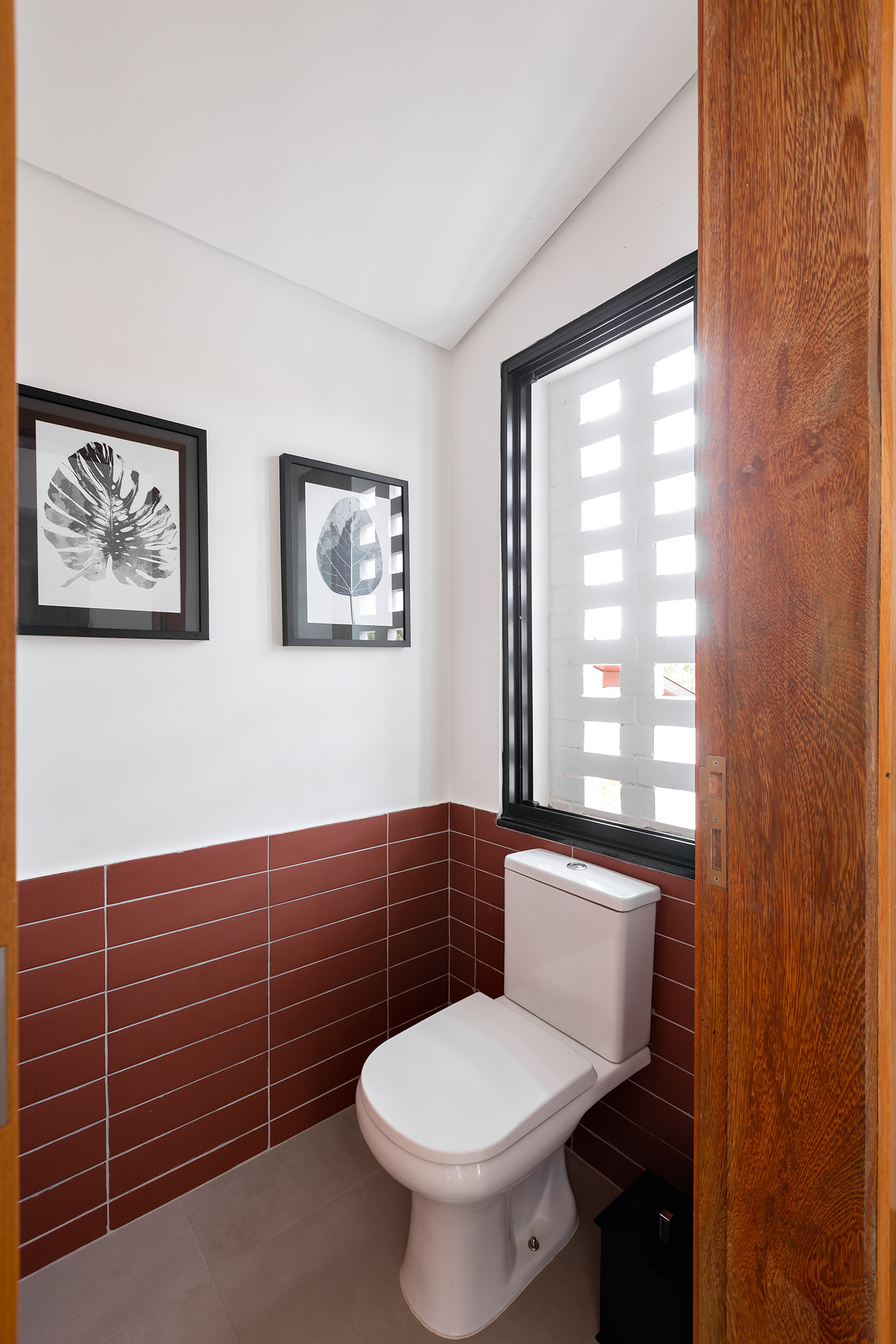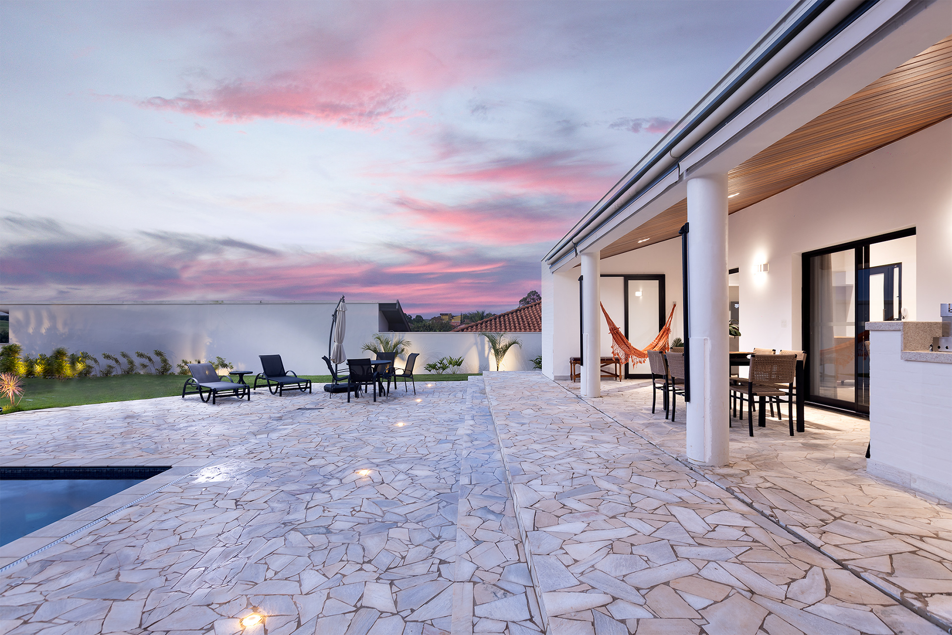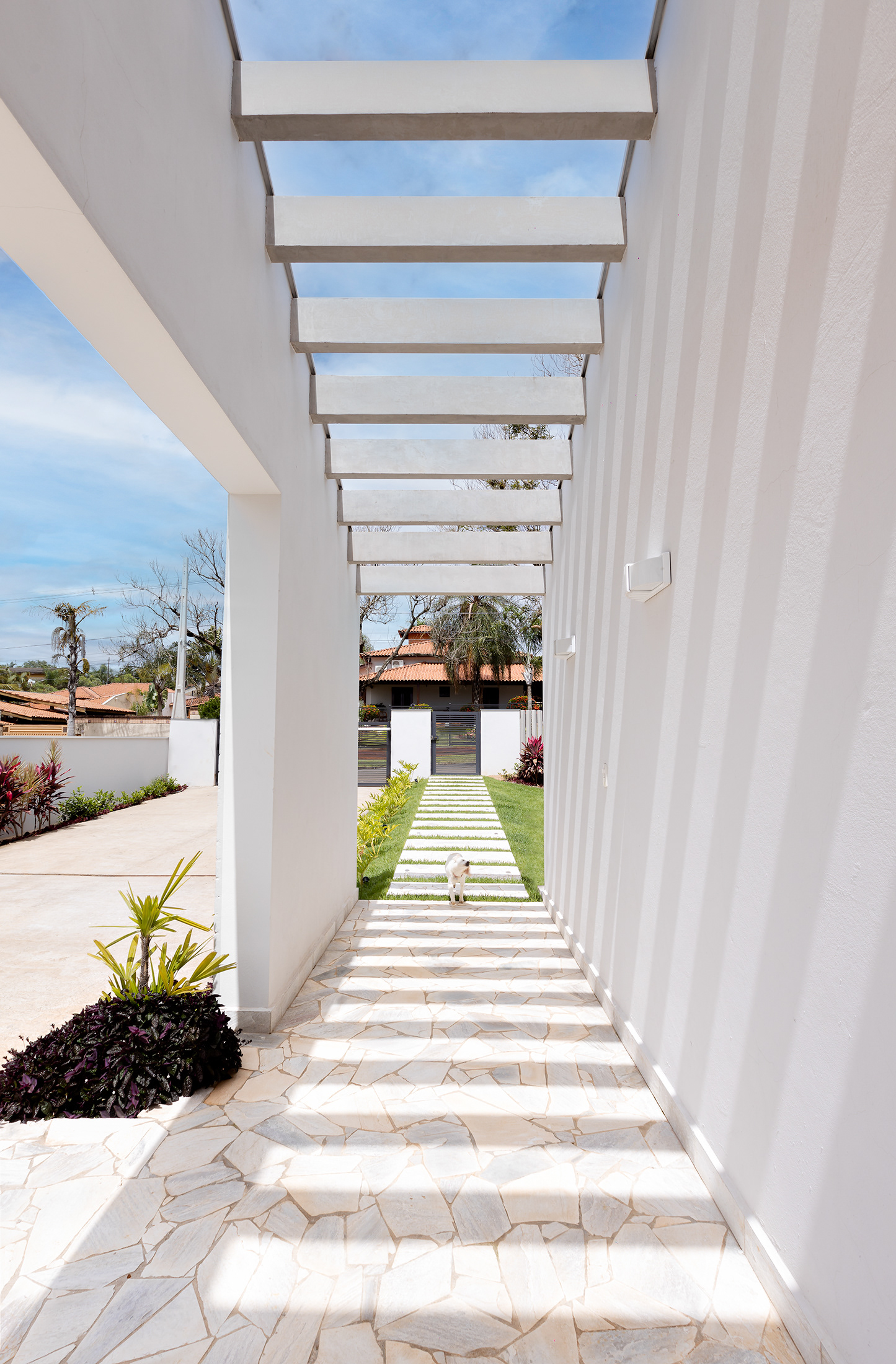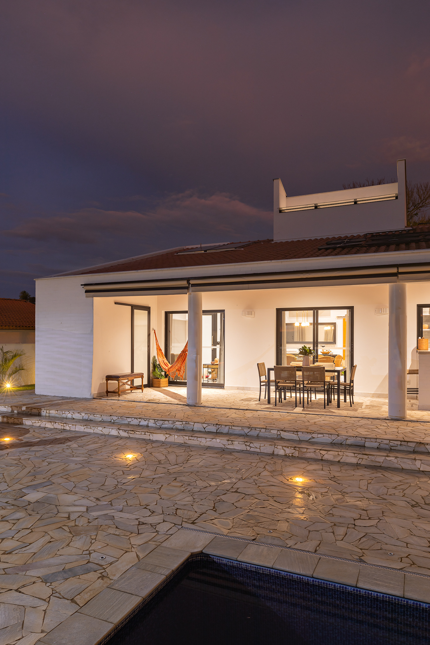 Casa térrea com inspirações campestres. O tijolo pintado, telhado cerâmico e a varanda contínua marcam presença, em uma livre referência às famosas “casas de rancho”, típicas do interior paulista.