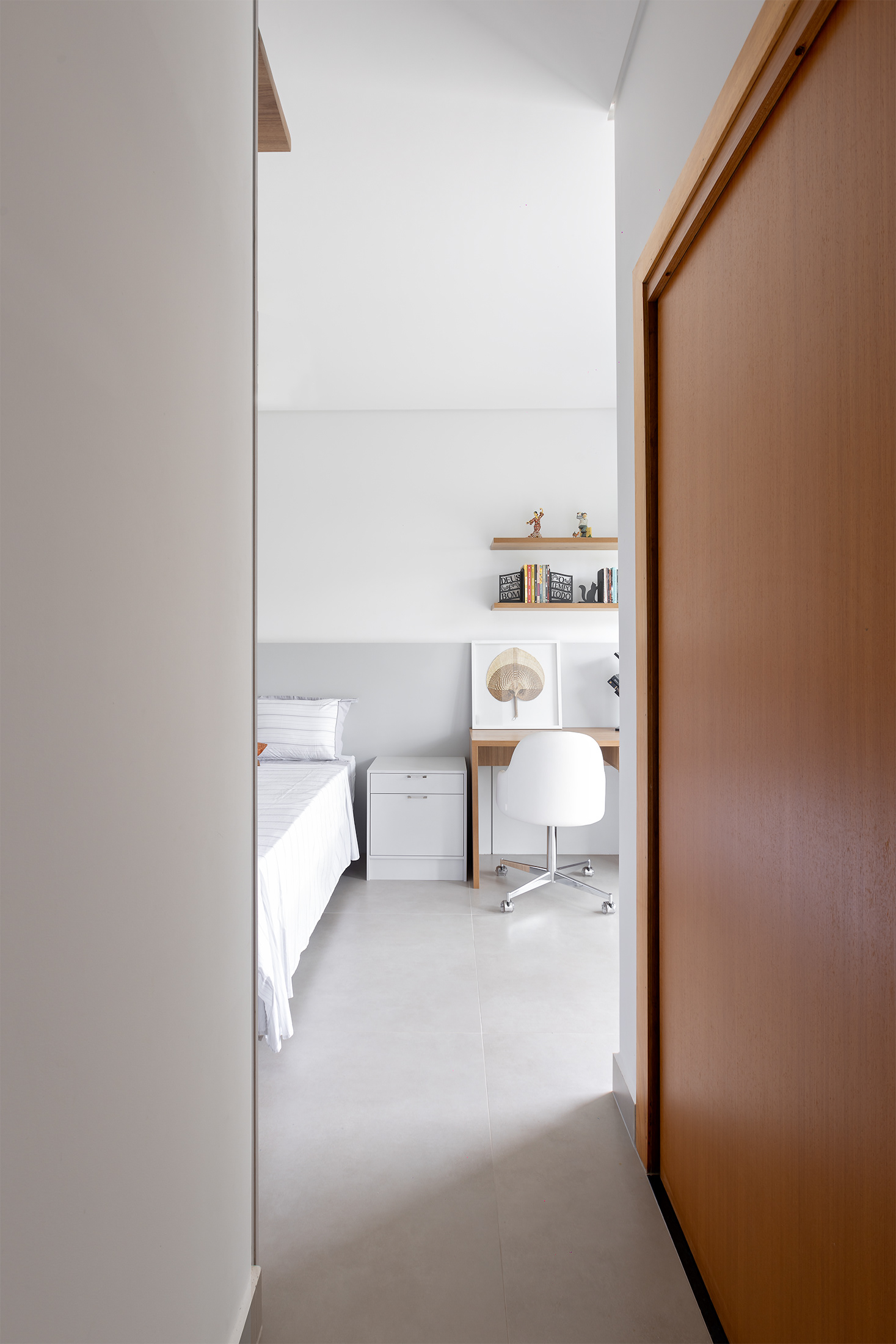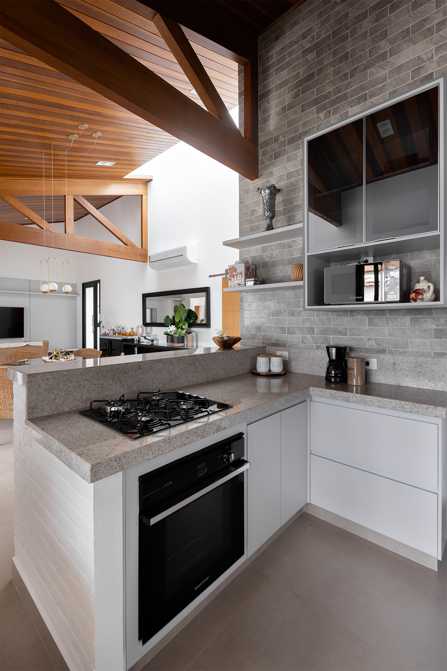 A cozinha em tons de cinza se destaca como um elemento de destaque, introduzindo uma variação na paleta de cores. Esta escolha de cores oferece uma interrupção visual no esquema predominantemente branco e amadeirado, conferindo profundidade e personalidade ao espaço.