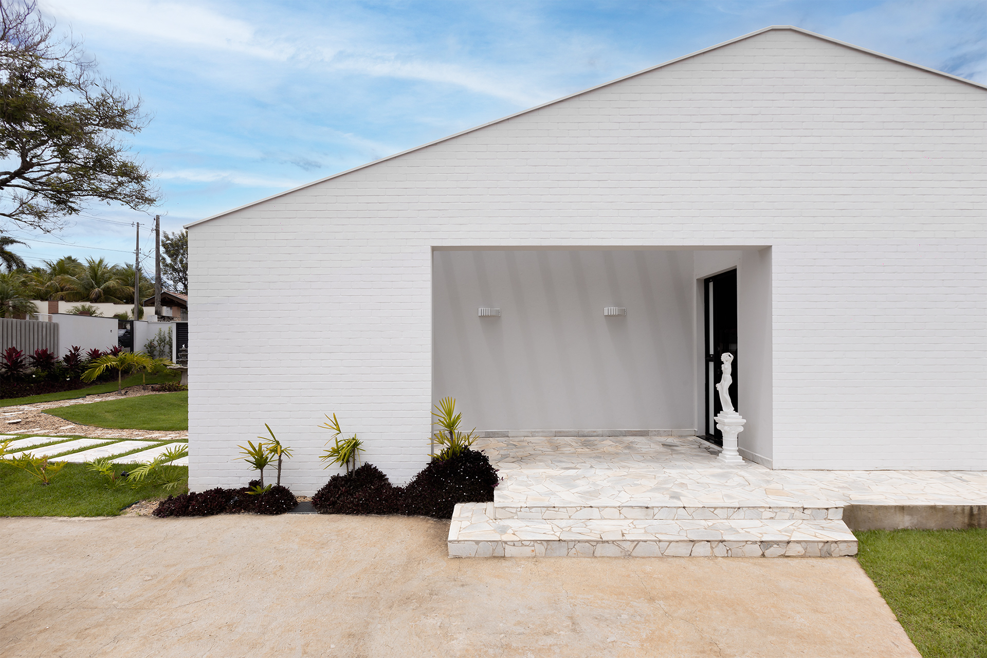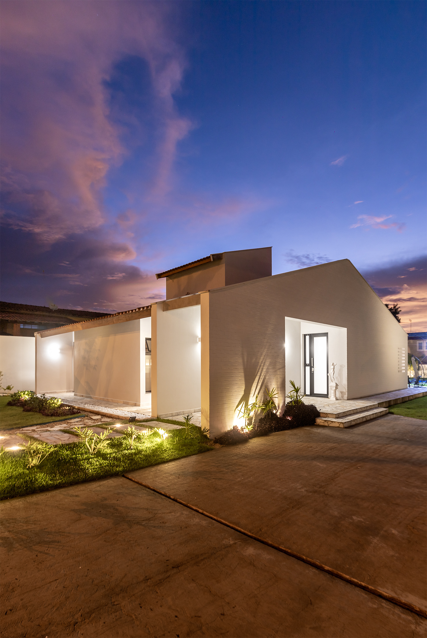 O branco é a cor predominante, oferecendo uma estética depurada que enfatiza a geometria da estrutura. No interior, a madeira desempenha um papel fundamental, com um foco especial no teto e nas vigas, proporcionando uma textura quente e rica, que atua como contraponto ao branco predominante, ao mesmo tempo que evoca a natureza e cria uma atmosfera acolhedora.