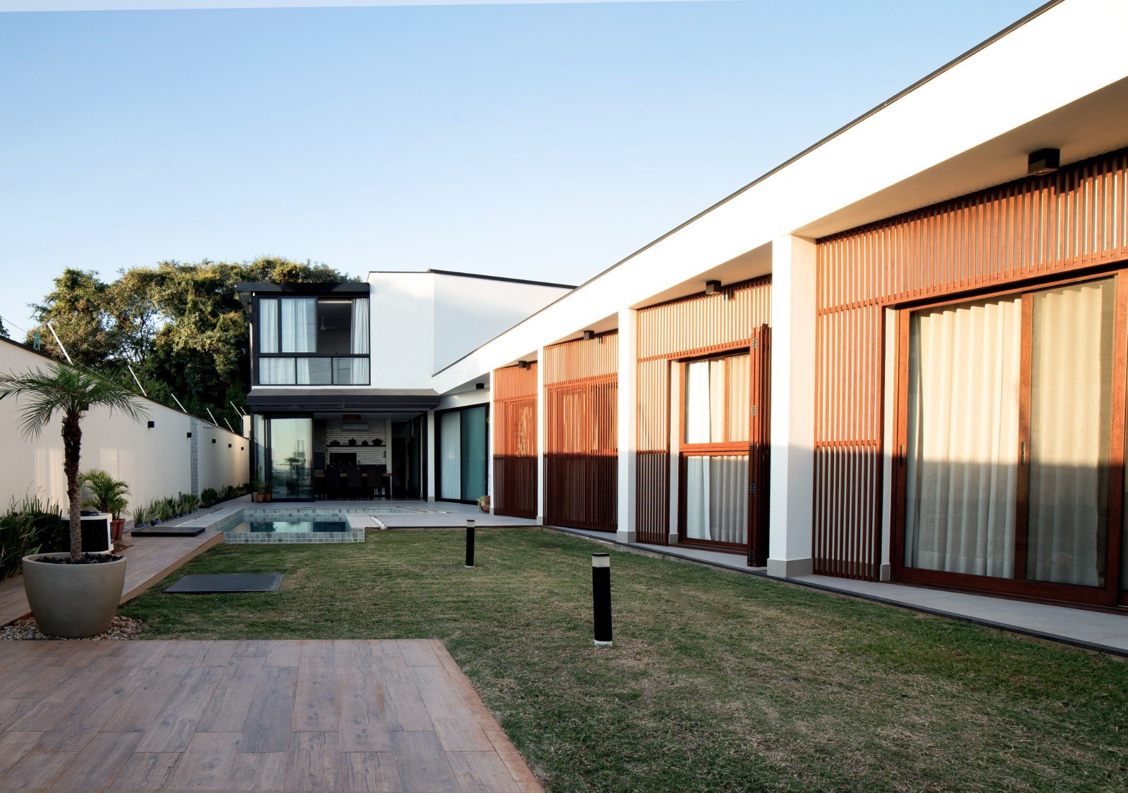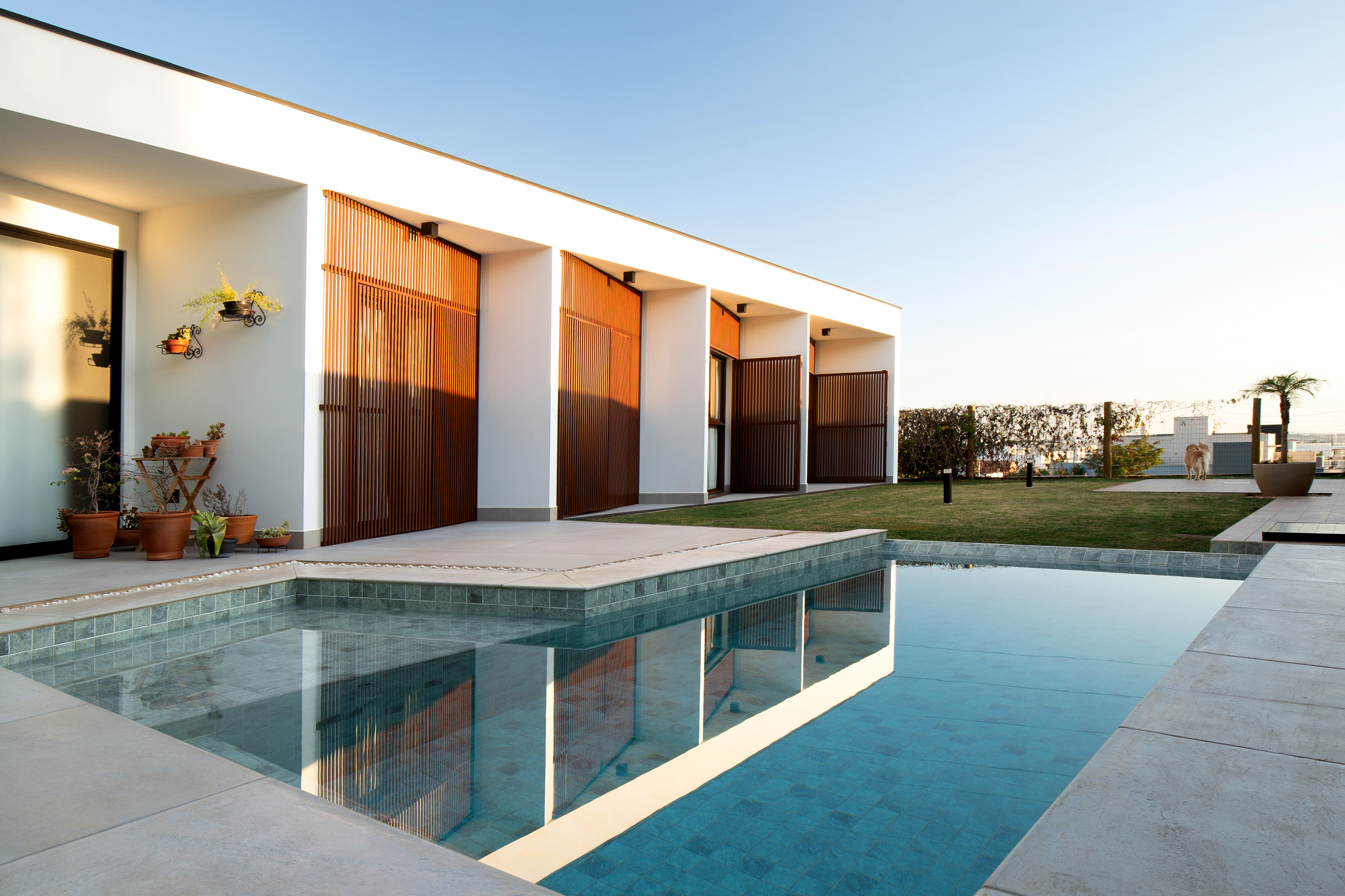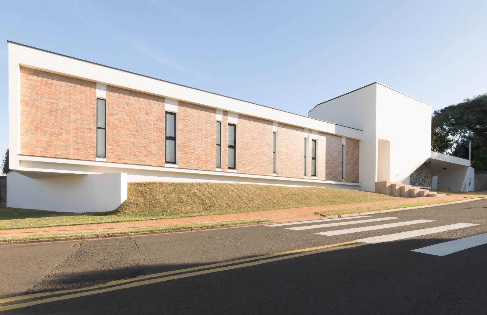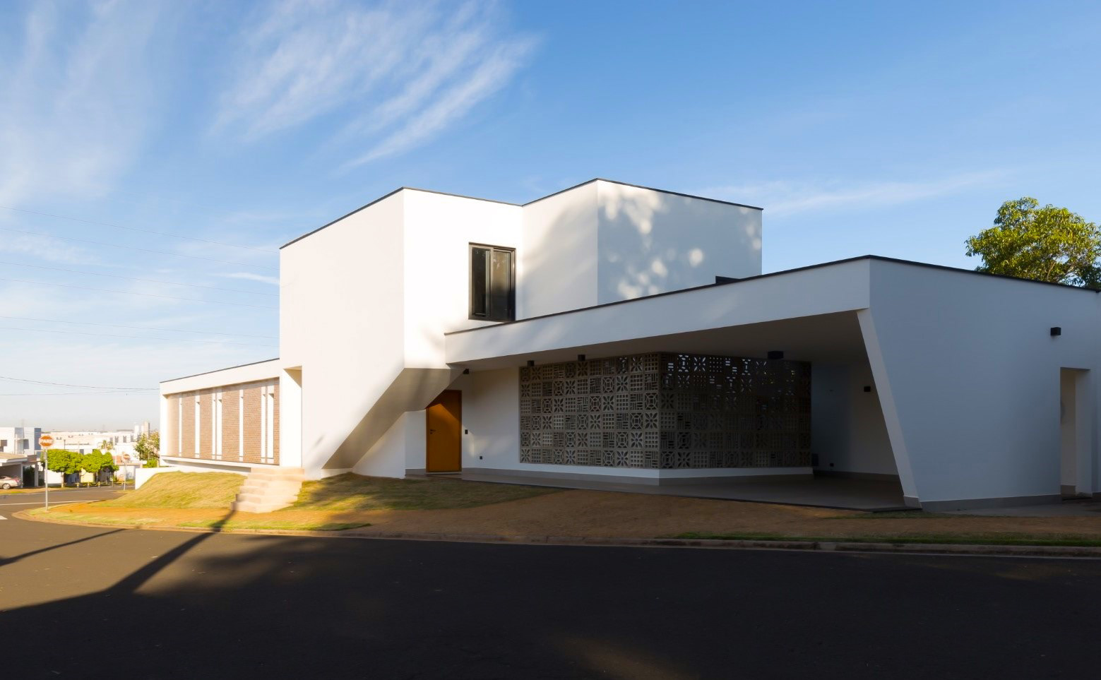 Projeção e Esquina: O balanço que se projeta em direção à esquina é uma resposta direta à cota do jardim aterrado, reforçando a horizontalidade da composição.