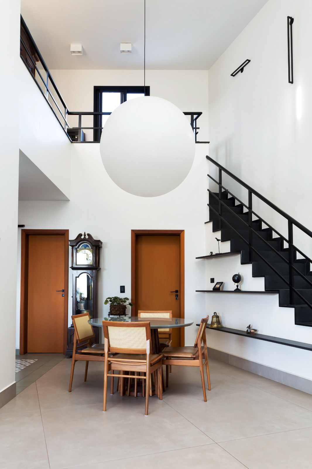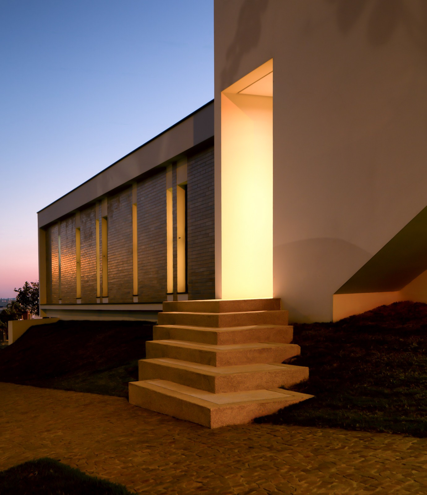 Fachada e Subtração: O volume cego da entrada principal surge como o "negativo" da escada interna, criando uma identidade marcante e escultórica logo no acesso.