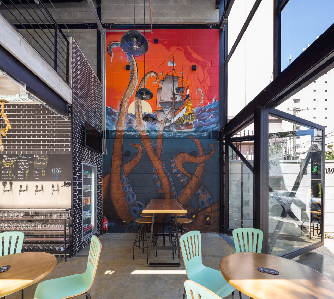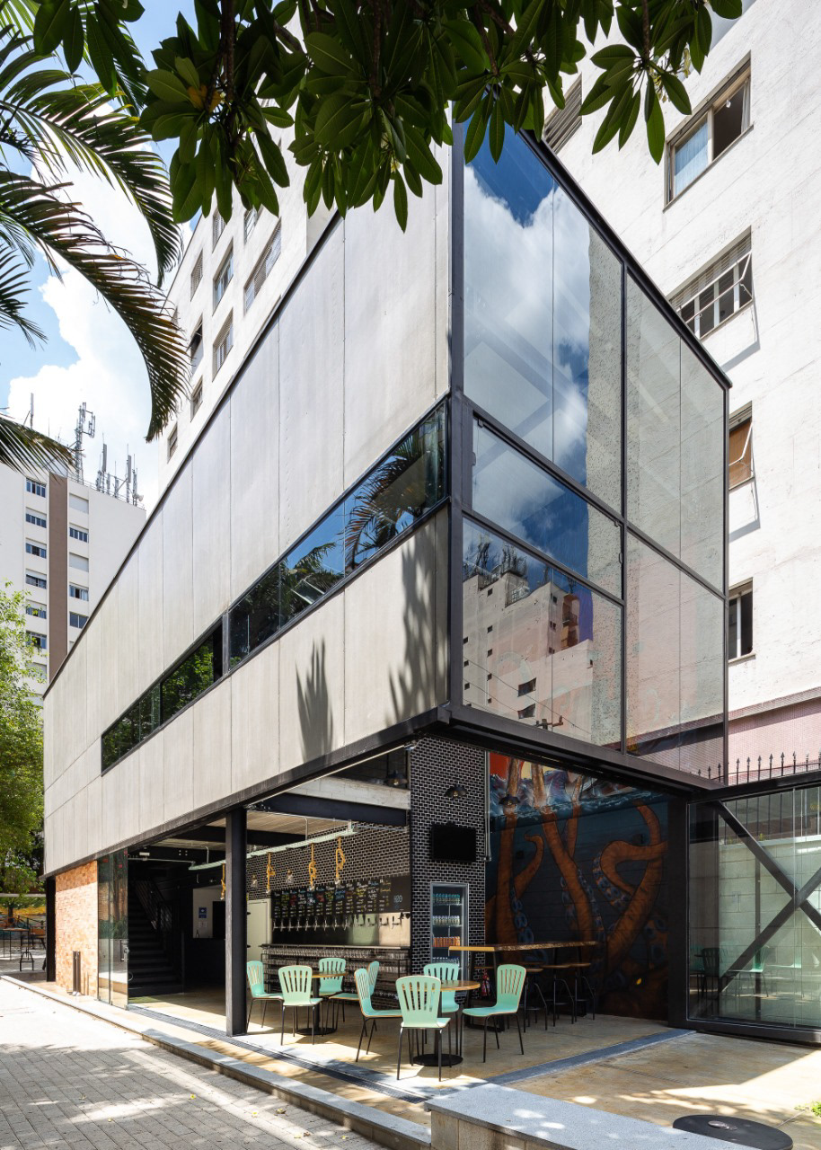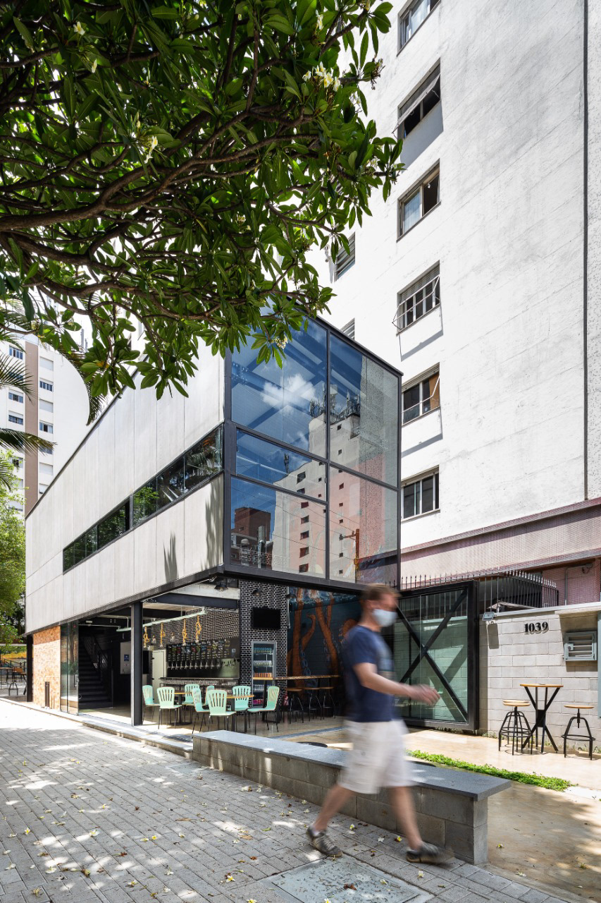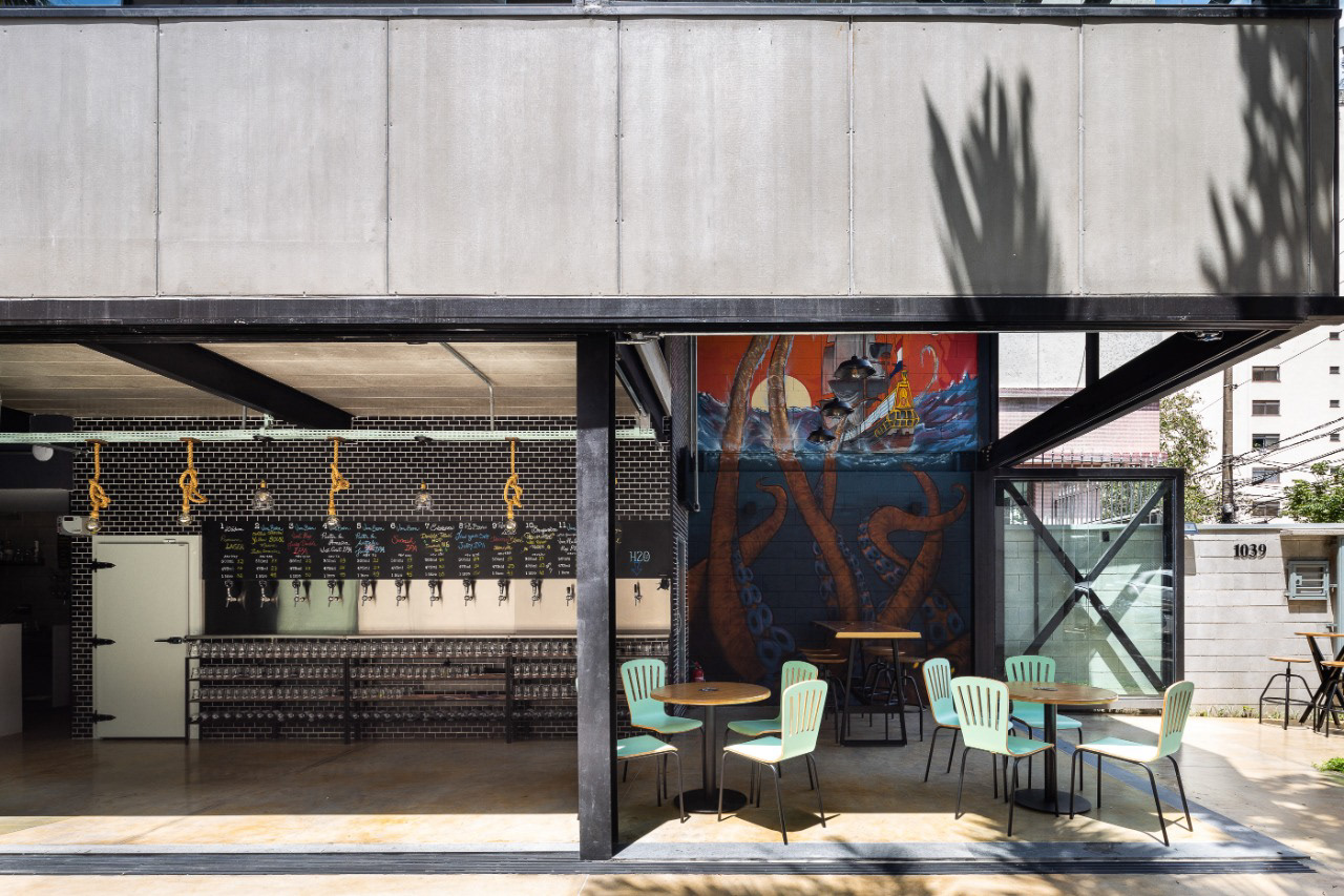 O térreo abriga as taps de cerveja, câmara fria, mesas, banheiros e depósito, enquanto o pavimento superior é um salão livre.