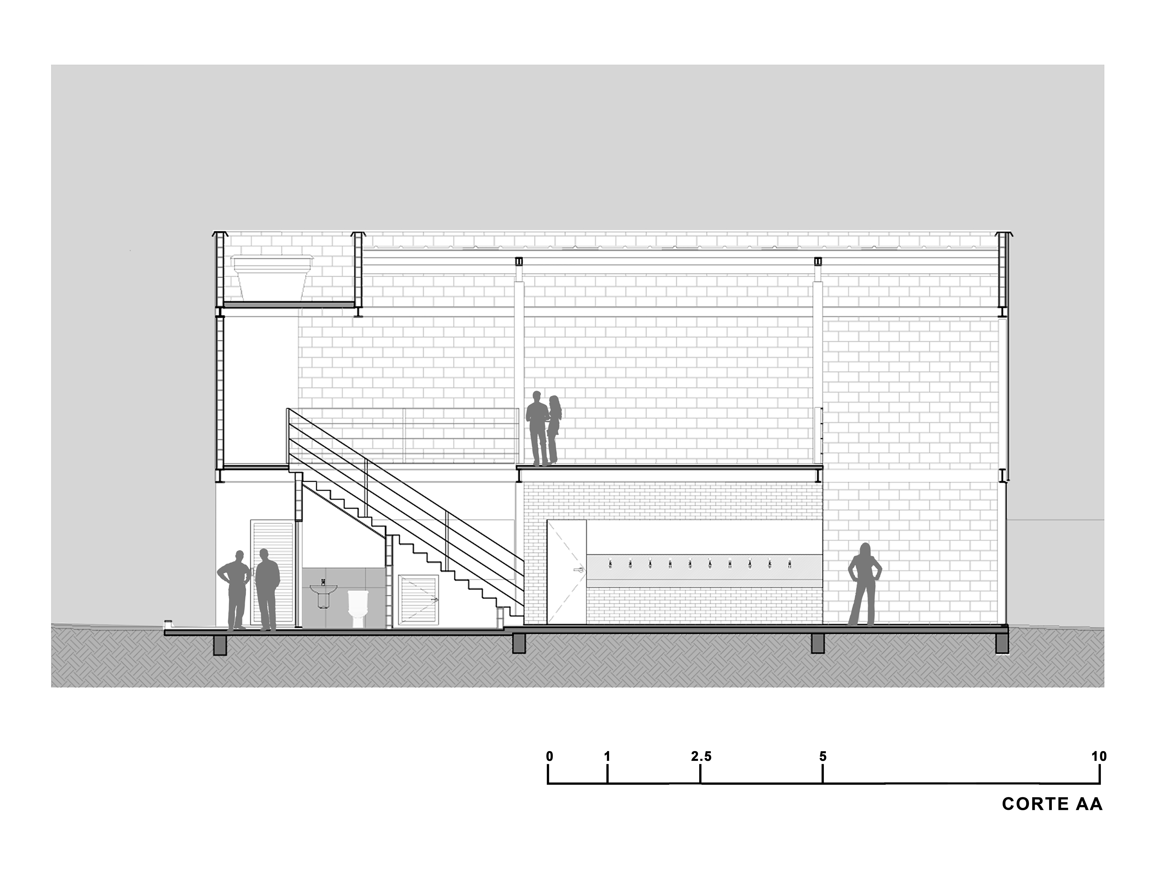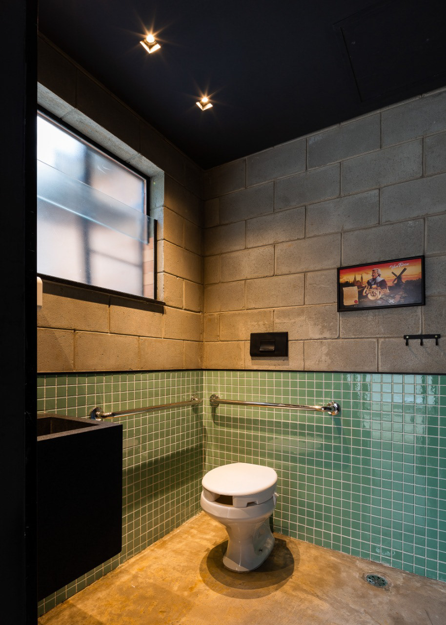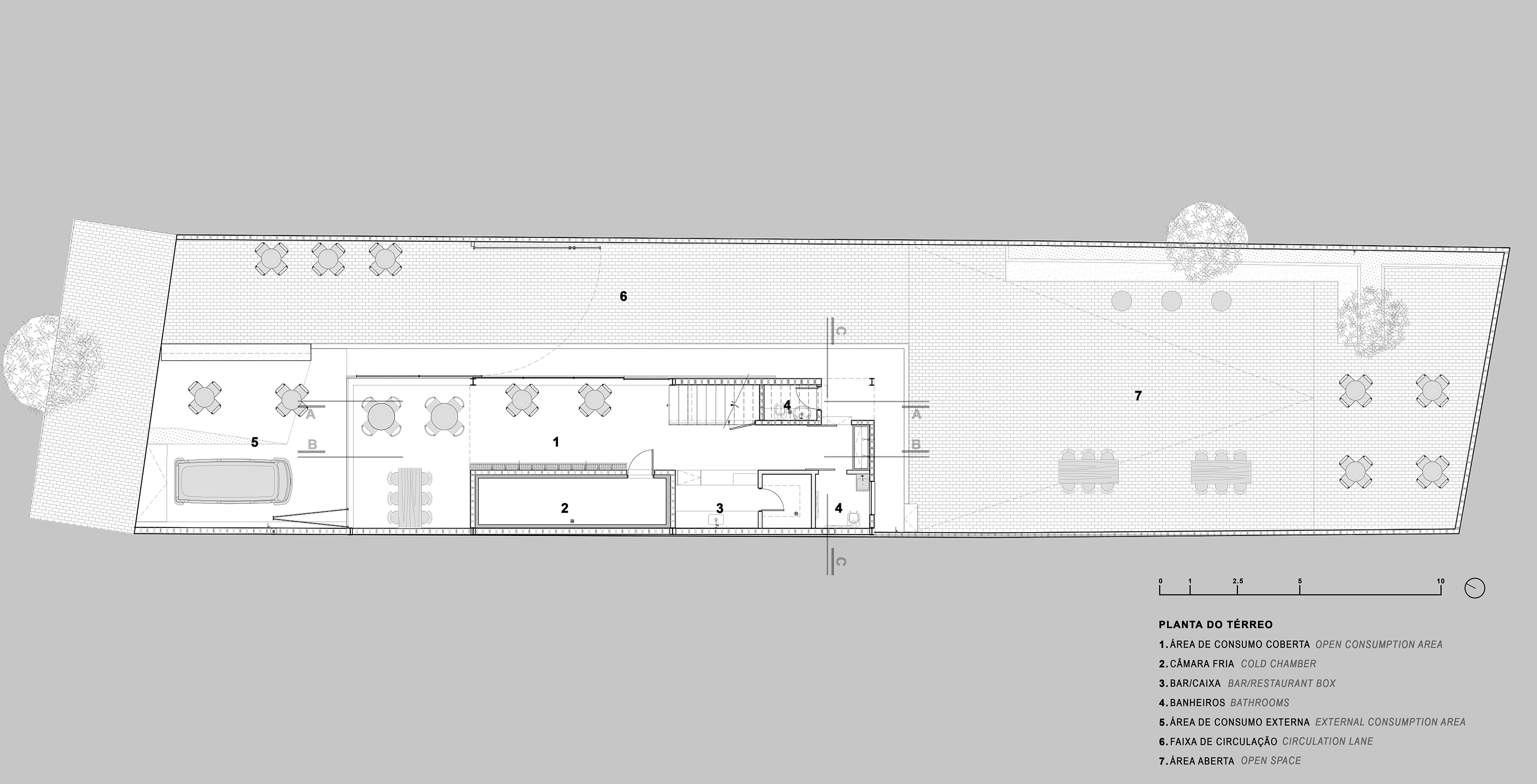 O térreo abriga as taps de cerveja, câmara fria, mesas, banheiros e depósito, enquanto o pavimento superior é um salão livre.