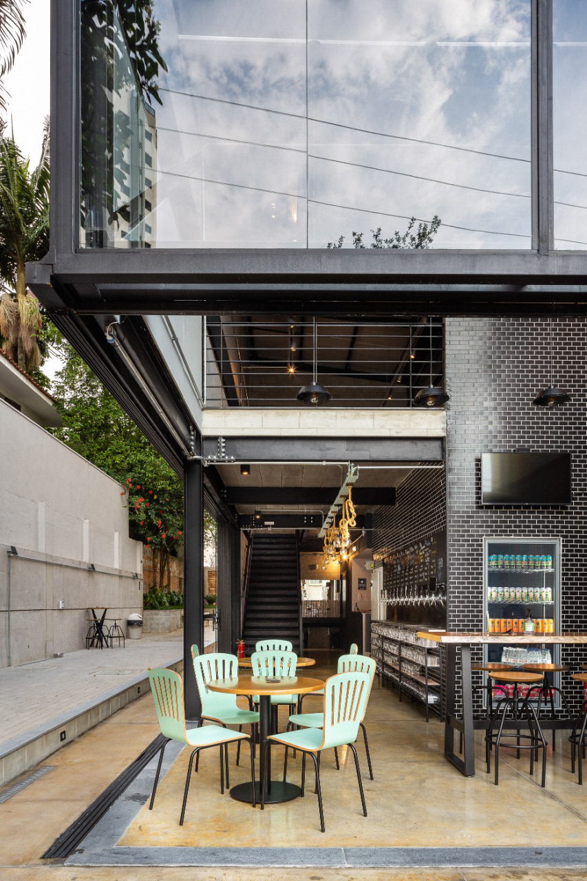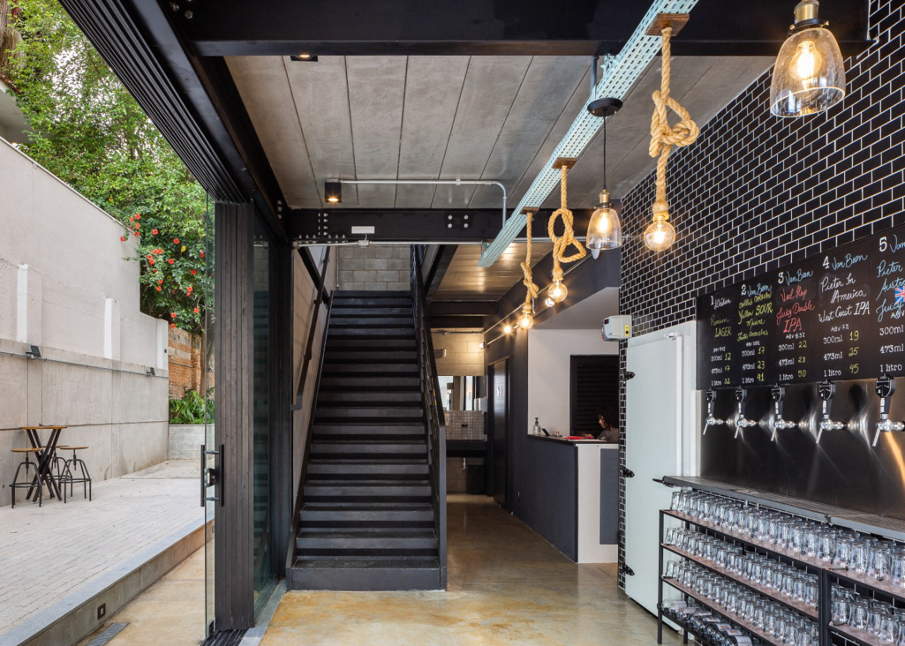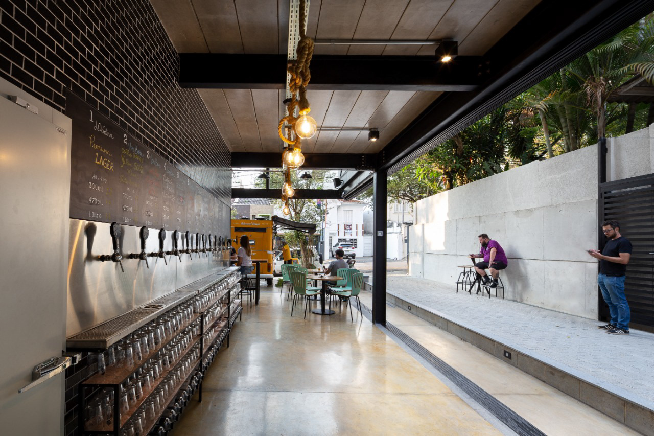 A cervejaria Van Been possui um projeto que integra o espaço interno e externo, com estrutura metálica para criar um ambiente aberto e acolhedor. As esquadrias de vidro reforçam essa ideia, permitindo ampla abertura entre o interior e as áreas externas.
