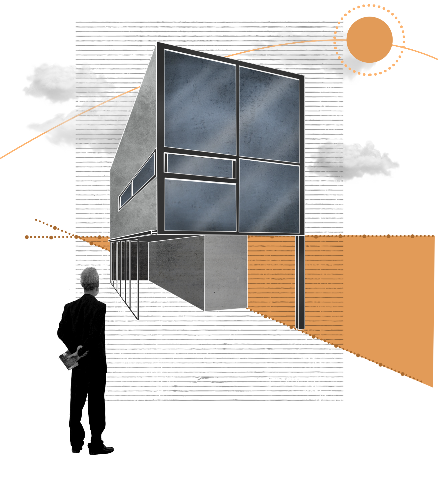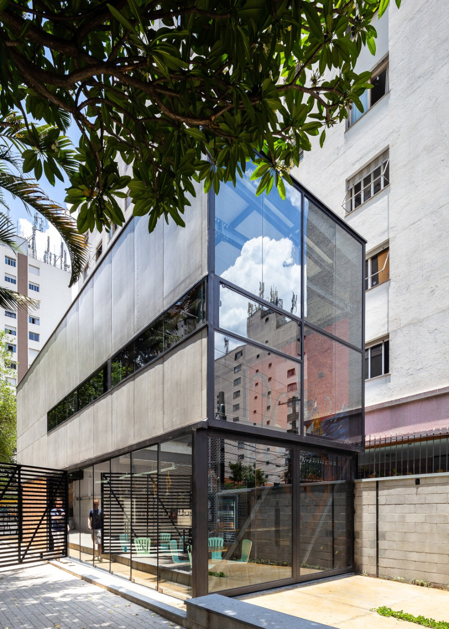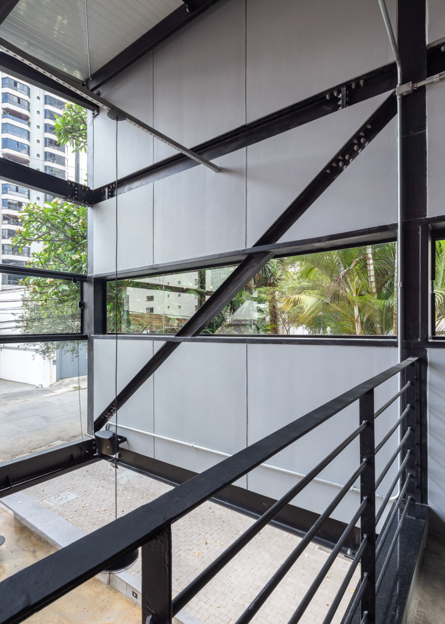 Selecionamos para acabamentos externos tijolos de revestimento e placas cimentícias, o que, junto com a estrutura metálica reforçam a identidade industrial do espaço. O projeto conta ainda com pequenos gestos que promovem o entorno urbano, como bancos, recuo frontal e um mural artístico visível para os frequentadores e pedestres.