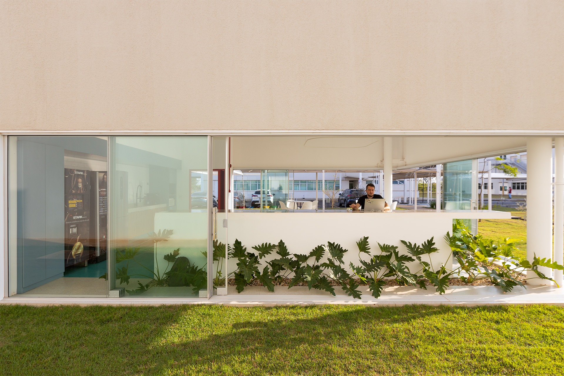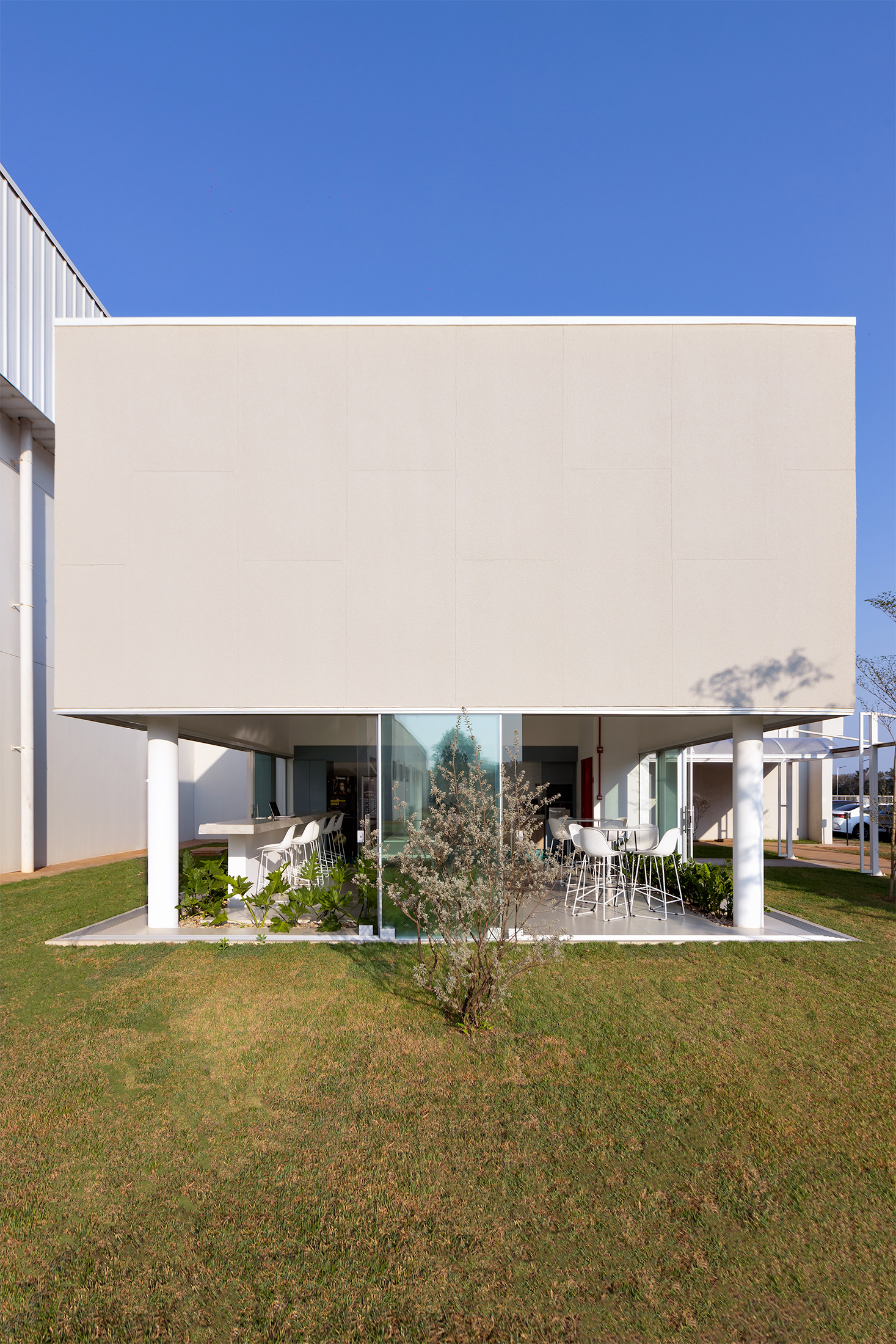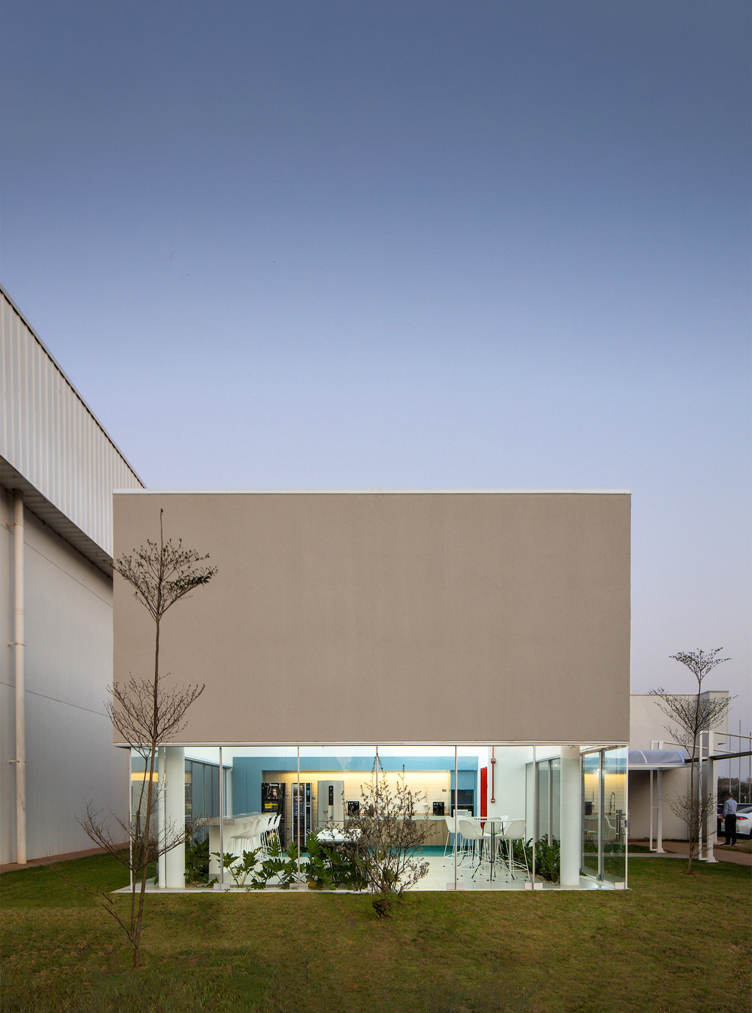 Recebemos a encomenda de projetar um edifício que concentrasse um local de café e alimentação rápida, e que deveria também, ser um ponto de encontro e reuniões informais para o escritório da empresa de autopeças. O prédio baseia-se na economia de elementos estruturais. A edificação resolve-se através de quatro pilares metálicos que sustentam uma cobertura sobre planta quadrada, liberando as fachadas para o uso de planos de vidro contínuos, que podem ser abertos completamente, criando uma integração plena entre interior e o exterior (jardim gramado).
