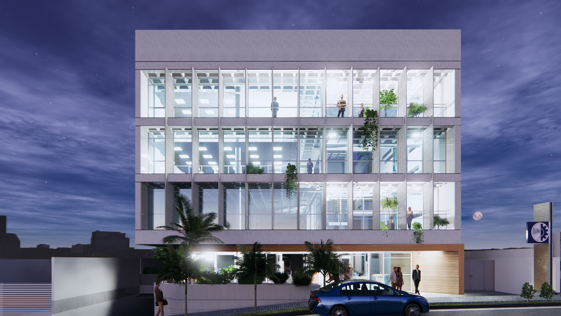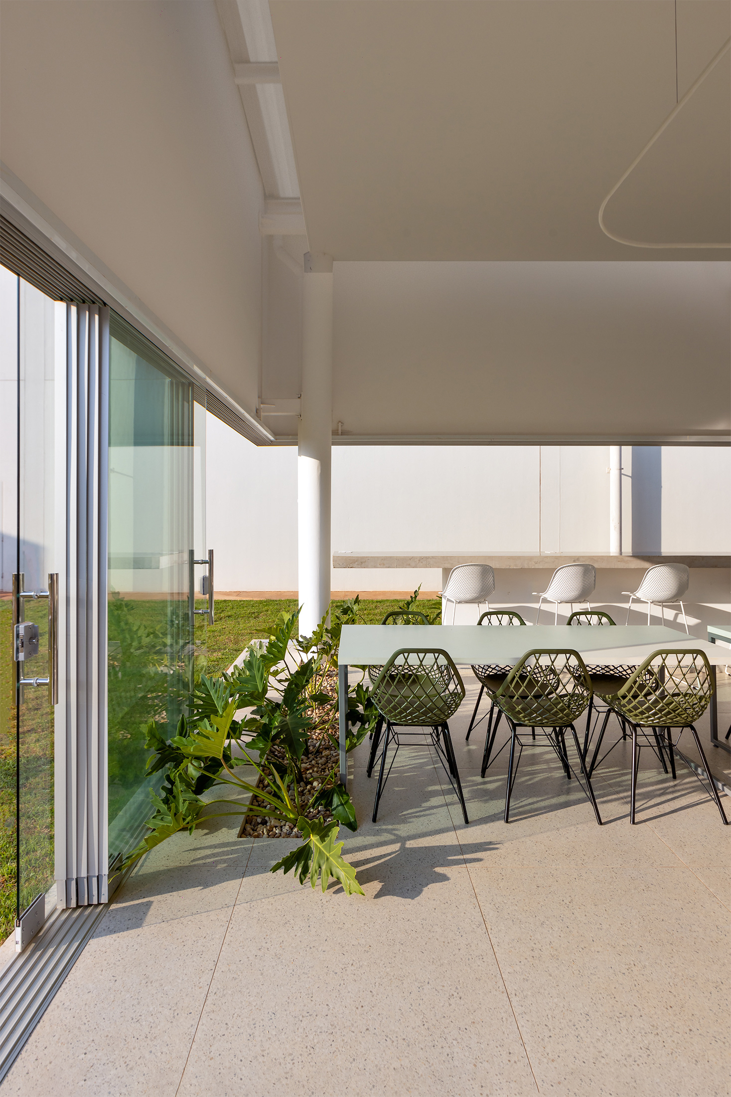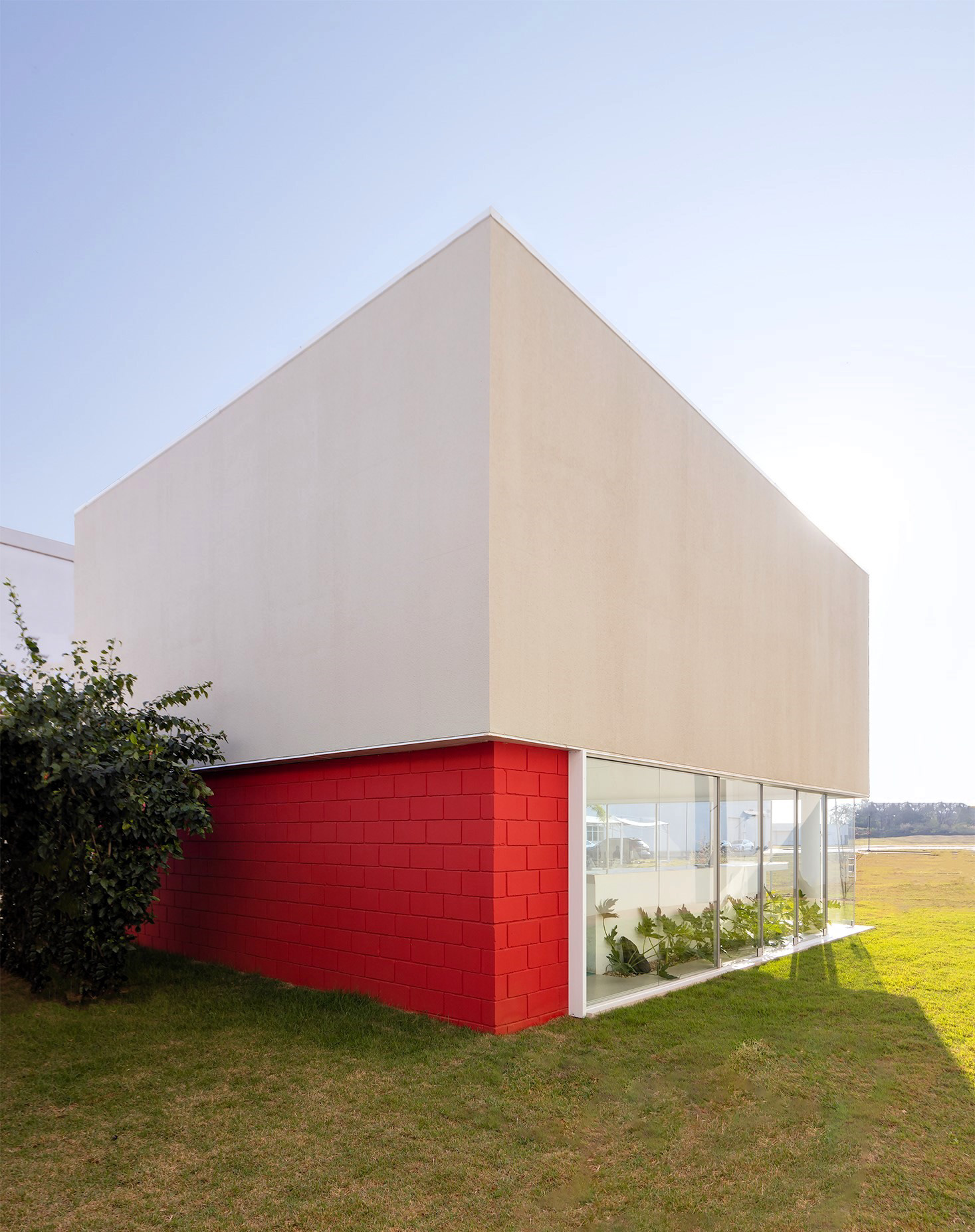 Recebemos a encomenda de projetar um edifício que concentrasse um local de café e alimentação rápida, e que deveria também, ser um ponto de encontro e reuniões informais para o escritório da empresa de autopeças. O prédio baseia-se na economia de elementos estruturais. A edificação resolve-se através de quatro pilares metálicos que sustentam uma cobertura sobre planta quadrada, liberando as fachadas para o uso de planos de vidro contínuos, que podem ser abertos completamente, criando uma integração plena entre interior e o exterior (jardim gramado).