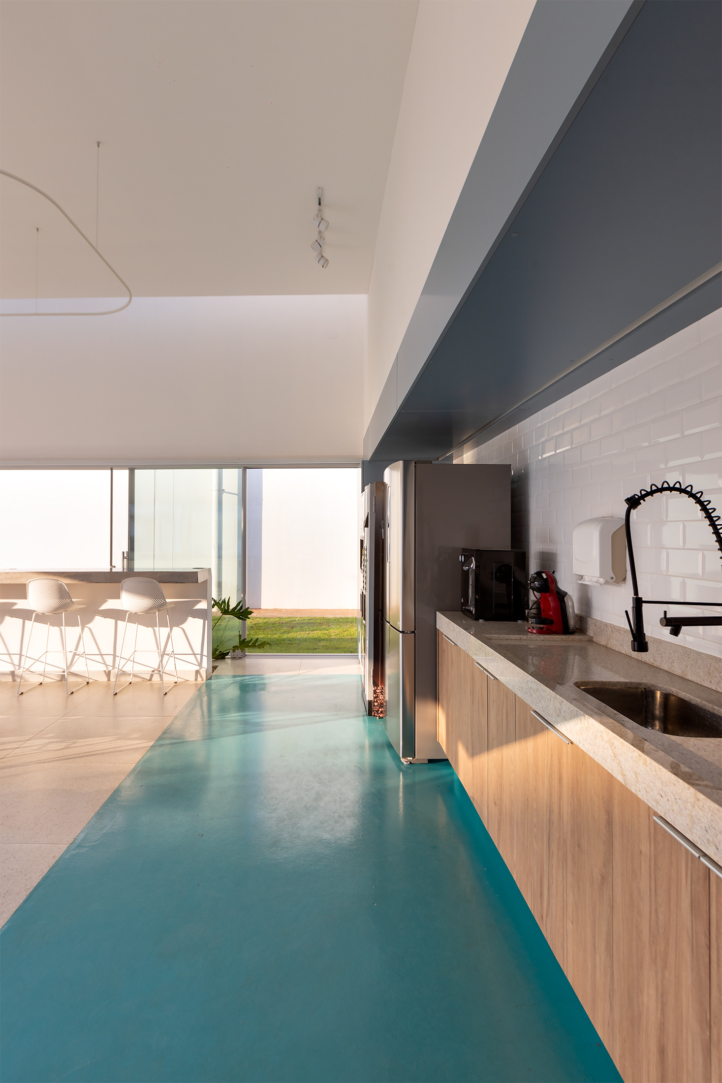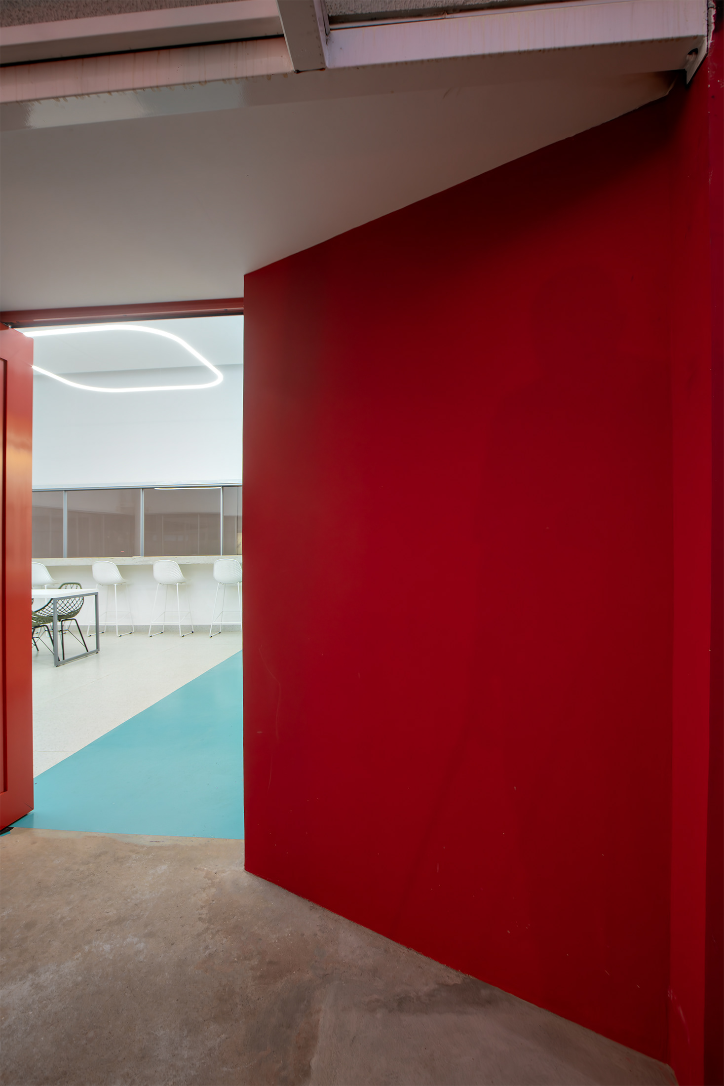A paleta cromática é restrita aos tons dos materiais naturais, acabamentos neutros e tons (vermelho e azul) que se comunicam com a paleta de cores da empresa. A simplicidade estrutural garante a funcionalidade técnica exigida pelo programa de necessidades, focando na clareza dos fluxos e na eficiência da área de preparo e consumo.