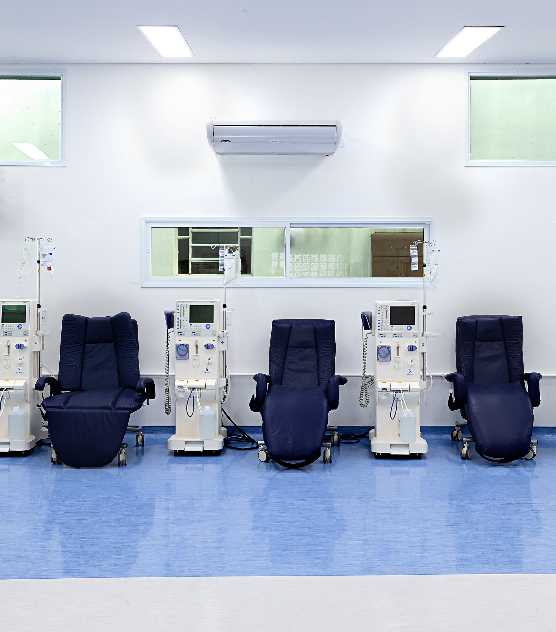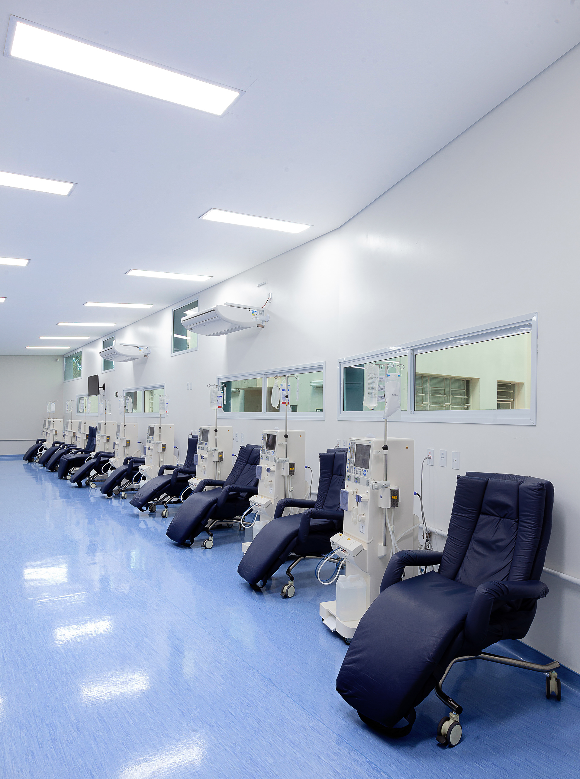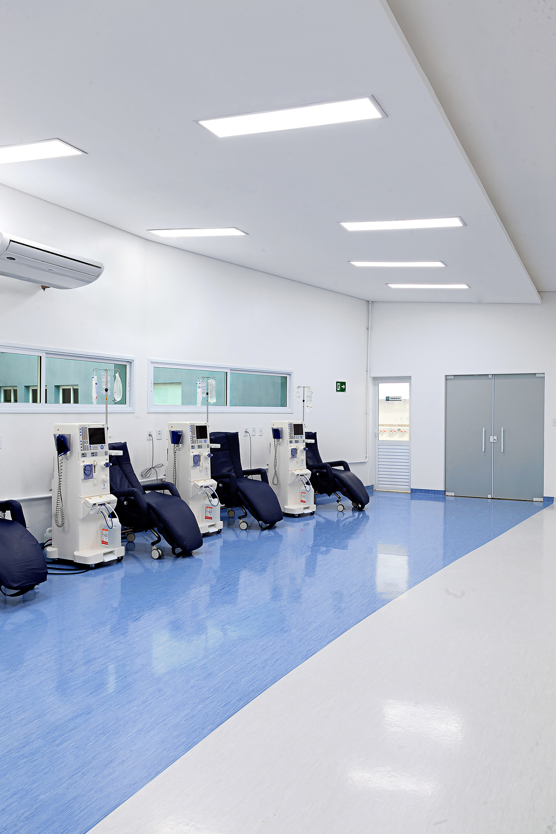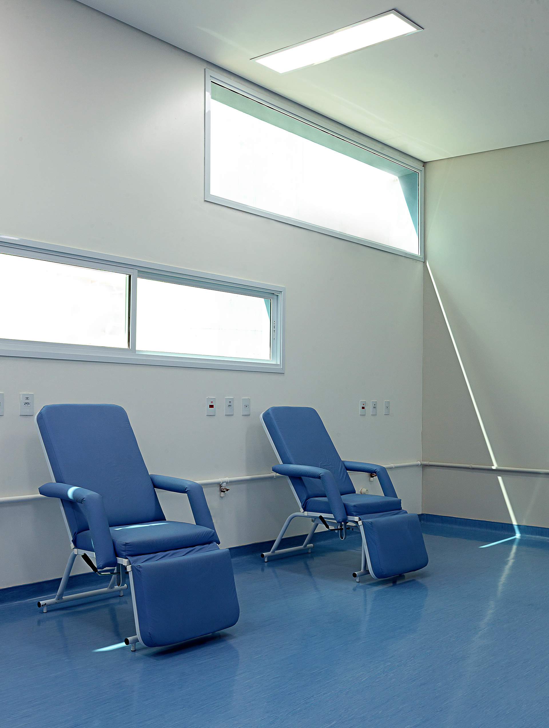 A cobertura foi desenhada com inclinação invertida em relação ao centro da cobertura (cumeeira). Assim, as paredes laterais tornam-se mais altas, permitindo a criação de uma segunda fileira de janelas, responsáveis por trazer iluminação natural extra para o interior do salão. A escolha dos revestimentos e cores, como o piso vinílico em tom azul claro, foi pensada para deixar o ambiente do salão mais agradável, reforçando a sensação de bem-estar aos pacientes.