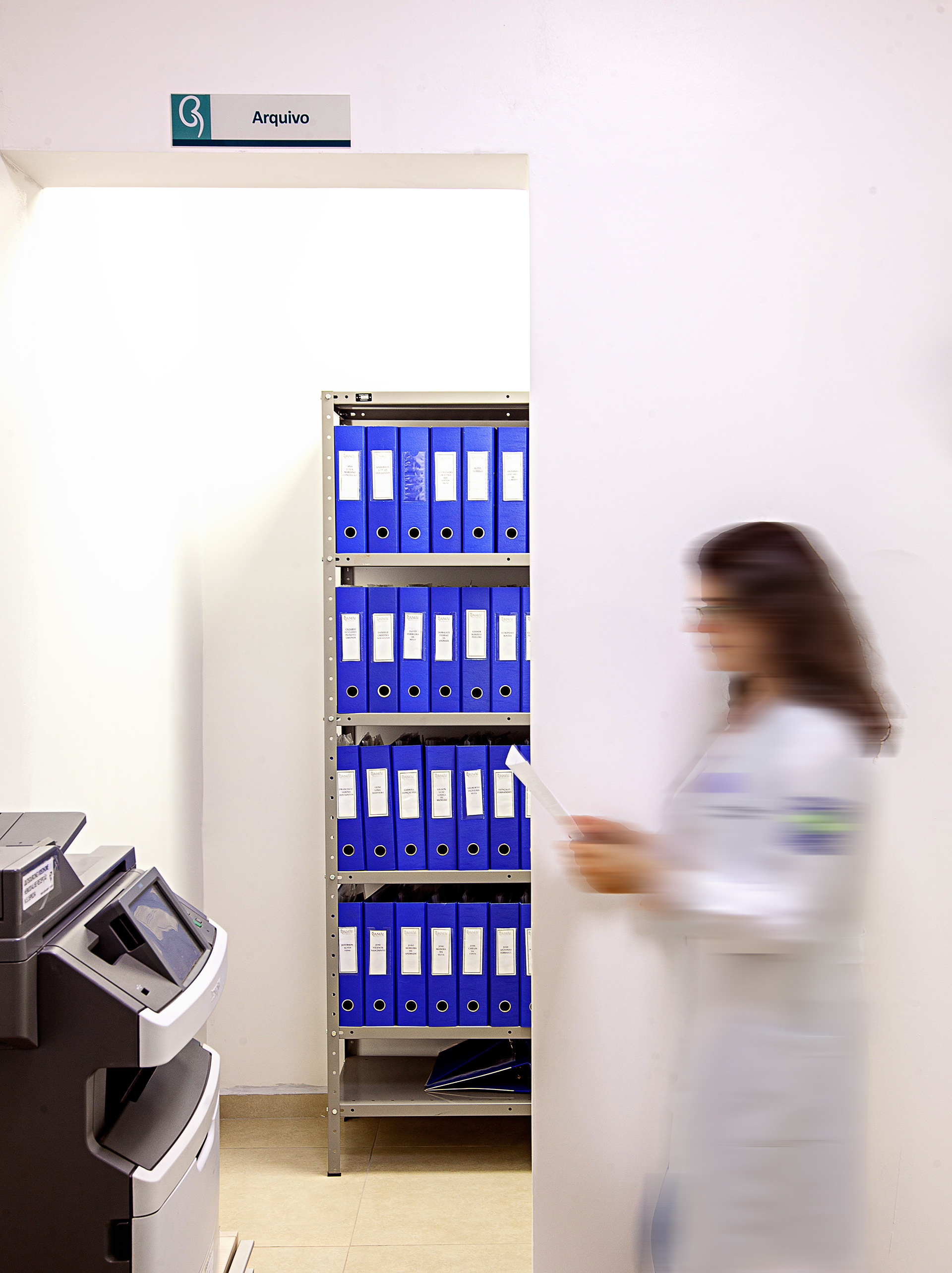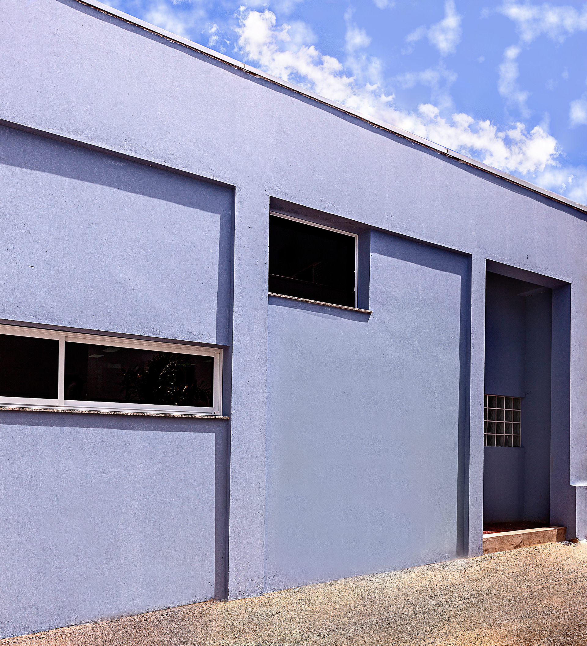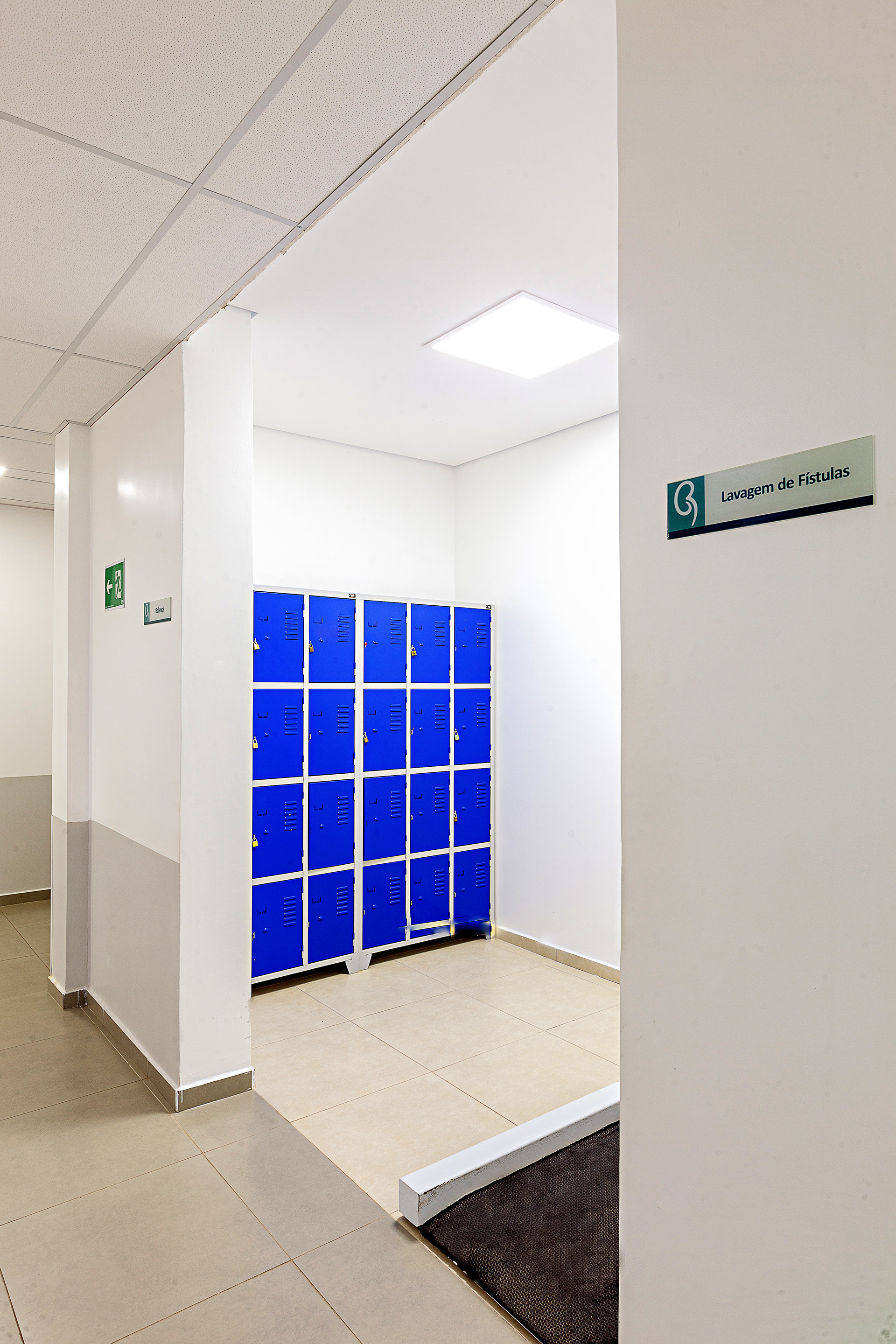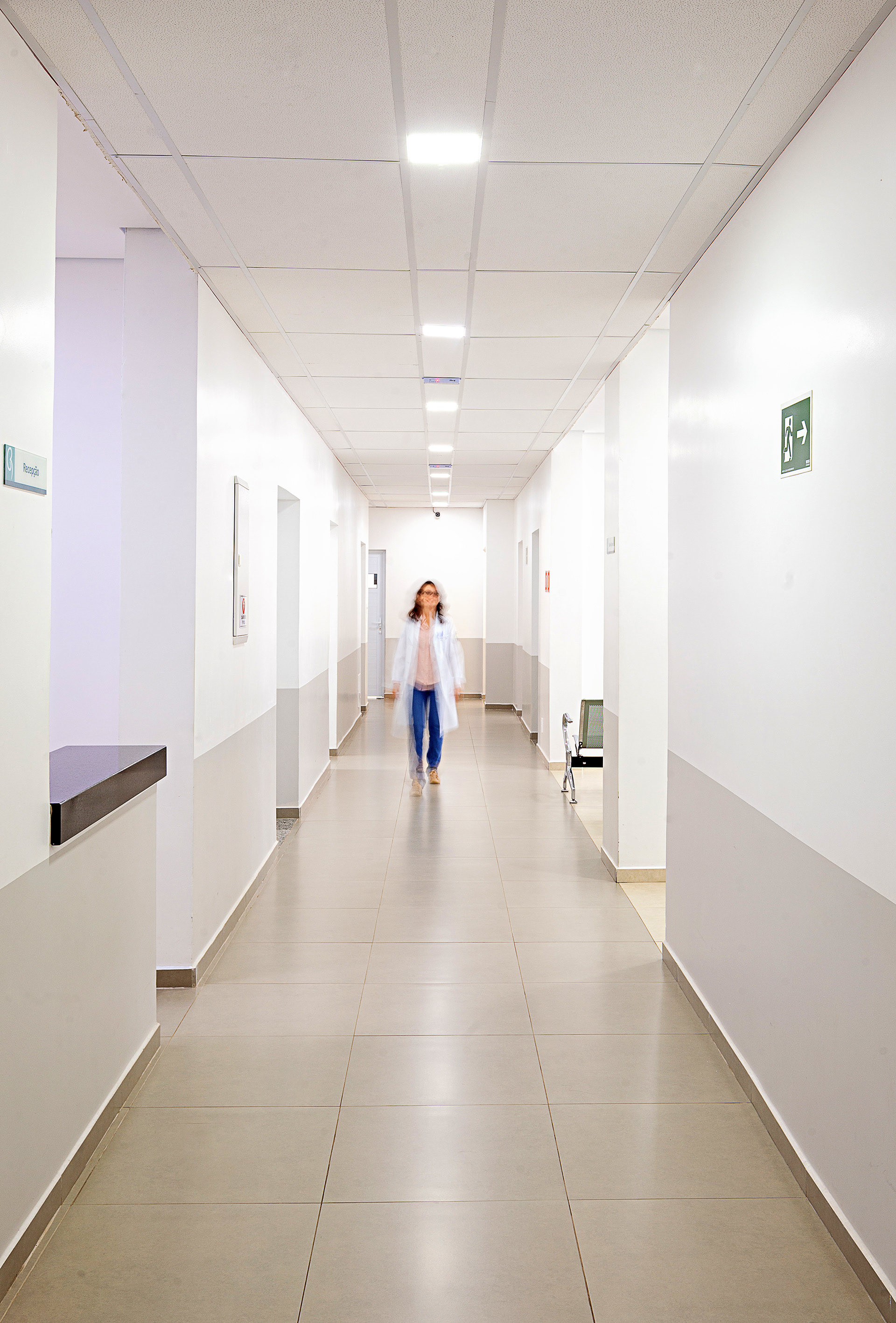A cobertura foi desenhada com inclinação invertida em relação ao centro da cobertura (cumeeira). Assim, as paredes laterais tornam-se mais altas, permitindo a criação de uma segunda fileira de janelas, responsáveis por trazer iluminação natural extra para o interior do salão. A escolha dos revestimentos e cores, como o piso vinílico em tom azul claro, foi pensada para deixar o ambiente do salão mais agradável, reforçando a sensação de bem-estar aos pacientes.