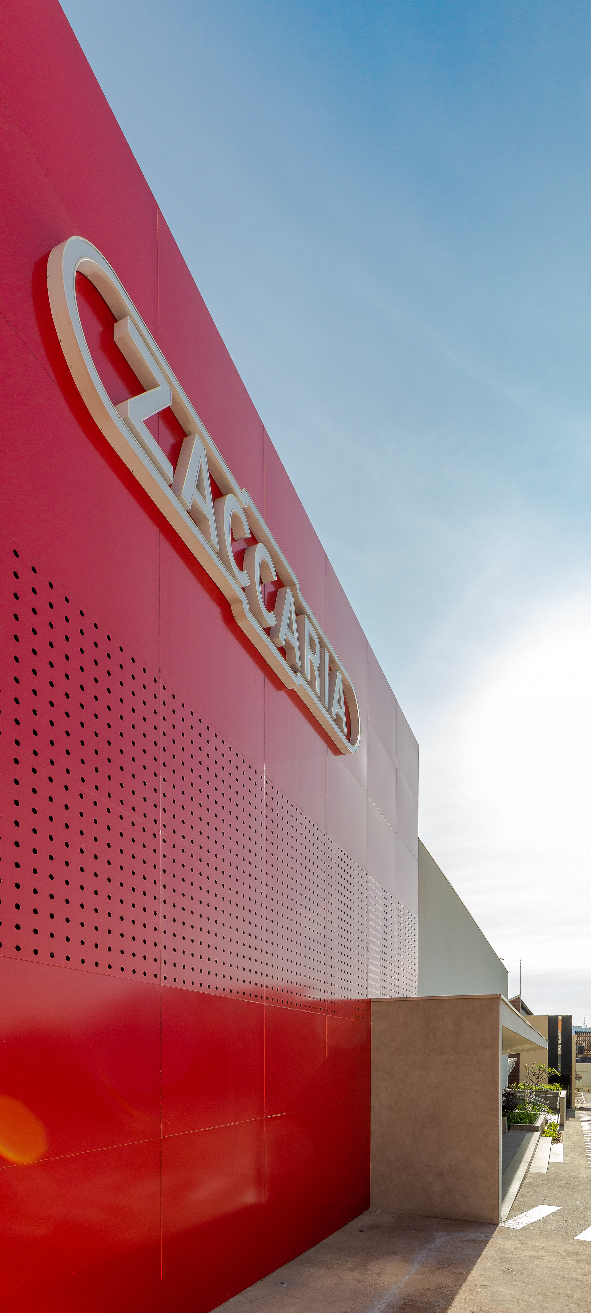 Contraste Volumétrico: Enquanto o volume principal assume o vermelho vibrante, o restante do galpão recebeu um tom branco leve, criando um contraste que enfatiza a estética minimalista da estrutura.