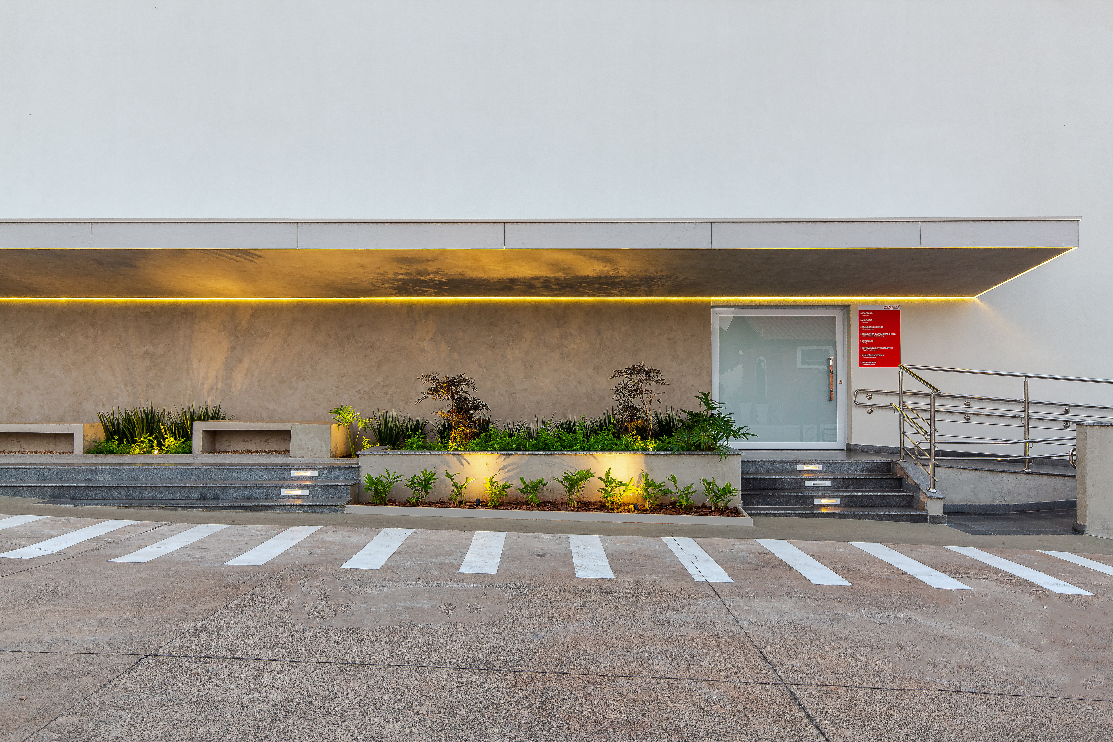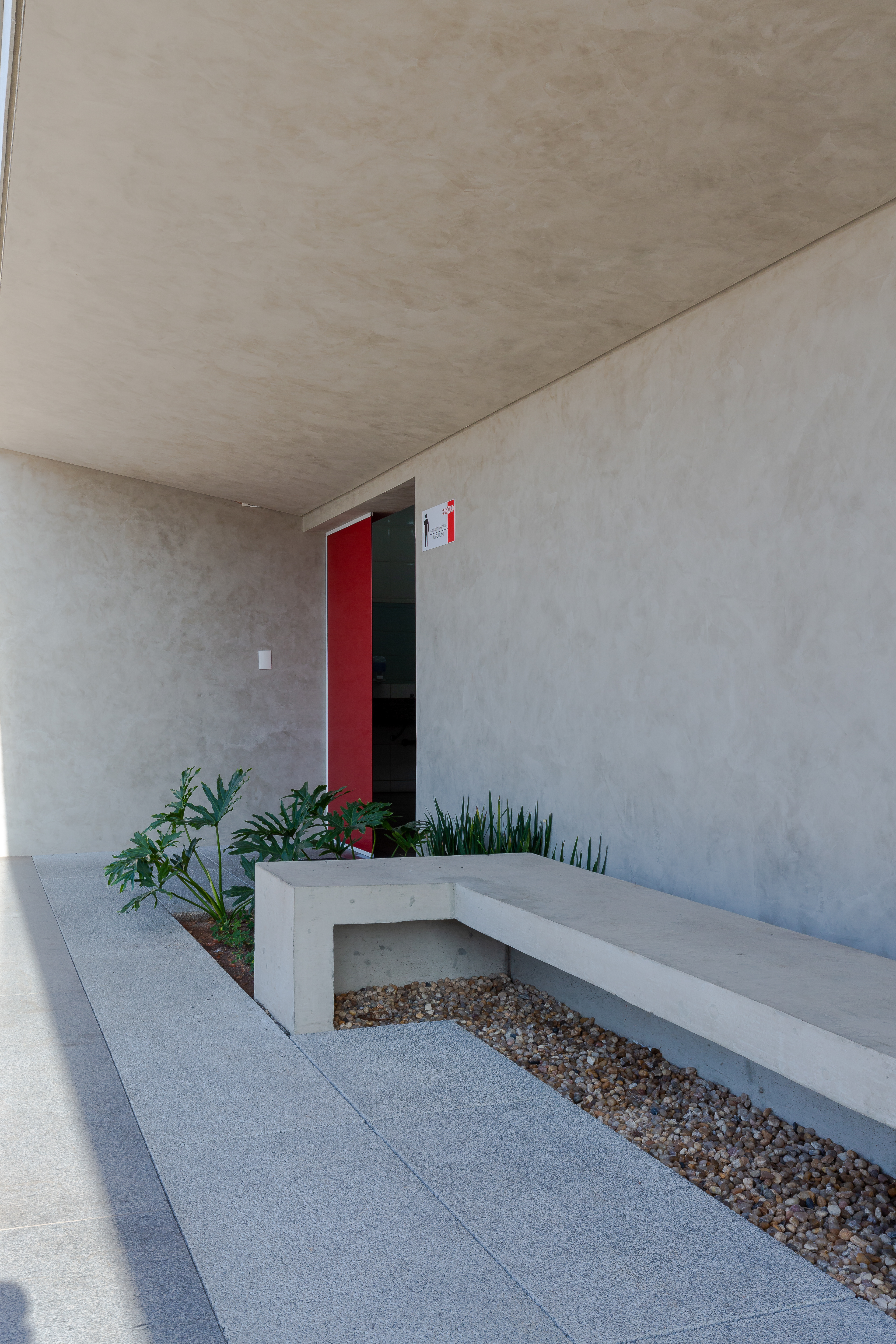 Horizontalidade e Estrutura: Foi projetada uma marquise de concreto em balanço que percorre a fachada, destacando a horizontalidade da edificação e conferindo proteção à área de acesso.