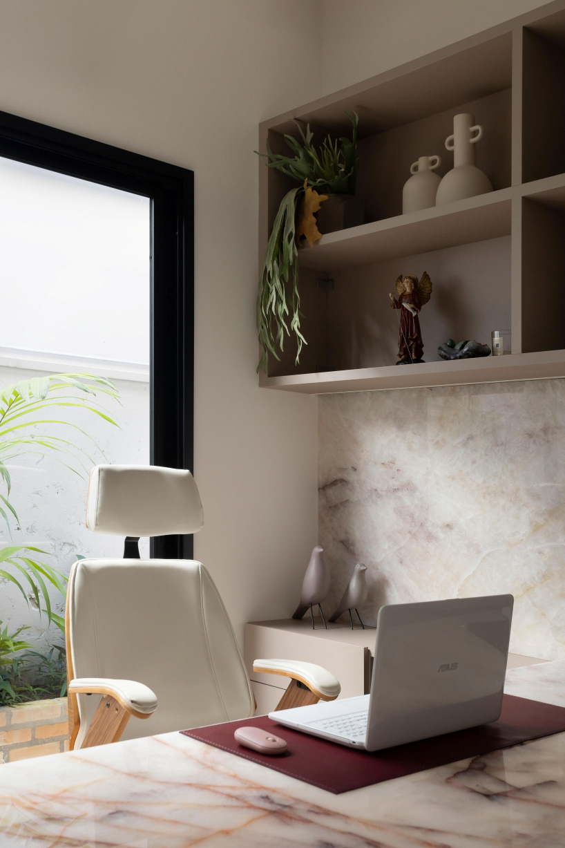 No interior, o design adota uma paleta calma e contida, caracterizada por linhas limpas e mobiliário sob medida. Materiais naturais, como ônix e madeira, trazem calor ao ambiente clínico, complementados por iluminação indireta e marcenaria detalhada.