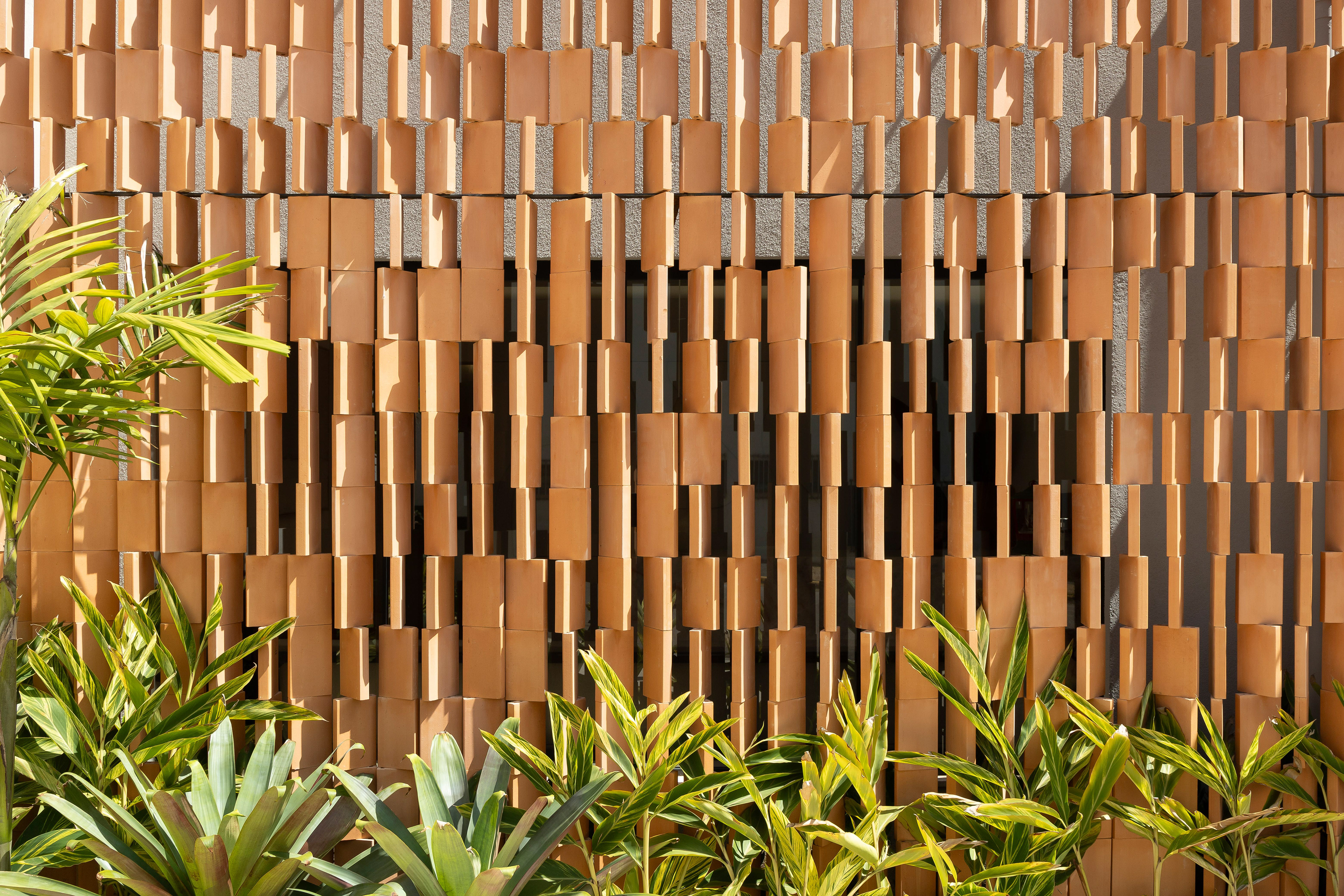 A proposta busca equilibrar o minimalismo dos espaços internos com um exterior dinâmico e texturizado, que cria um jogo de luz e sombra ao longo do dia. O brise-soleil cerâmico é composto por elementos modulares com diferentes profundidades e orientações, gerando uma sensação de movimento e evocando formações orgânicas naturais. Essa camada permeável garante privacidade e conforto térmico, ao mesmo tempo em que permite vislumbres do interior.
