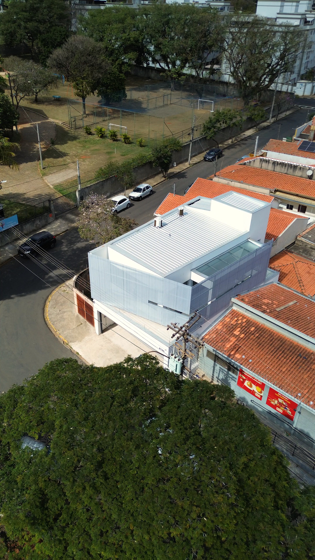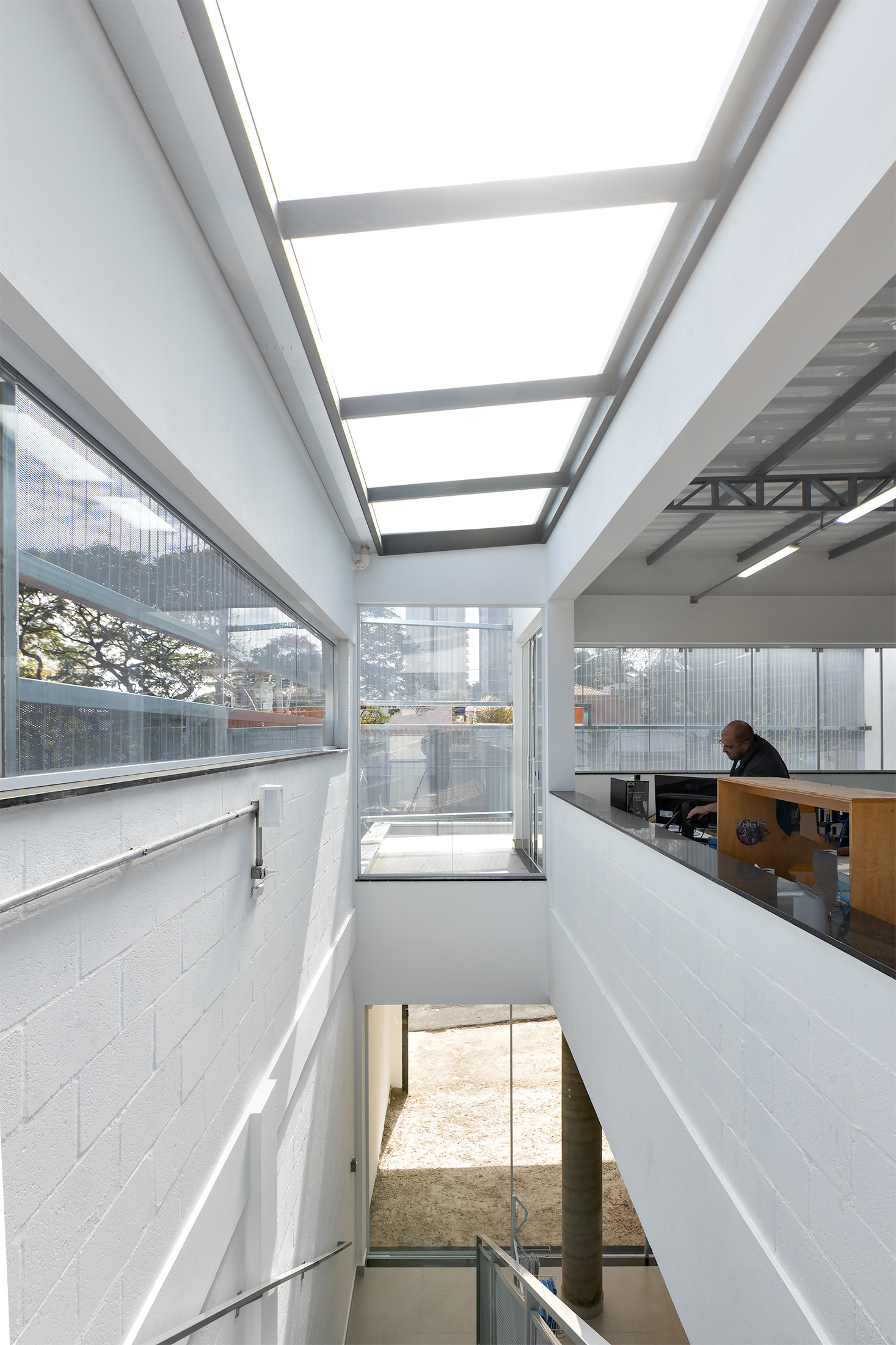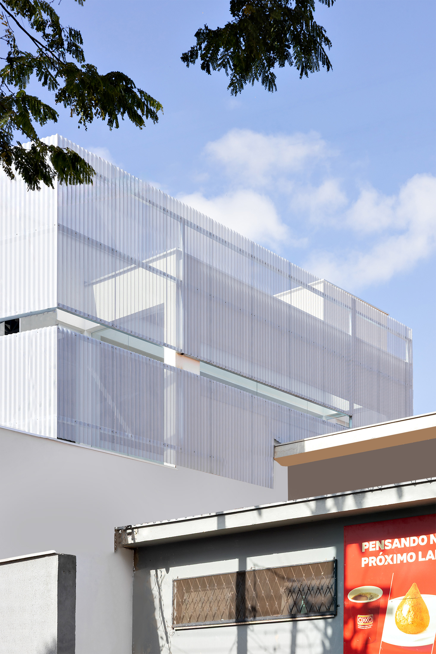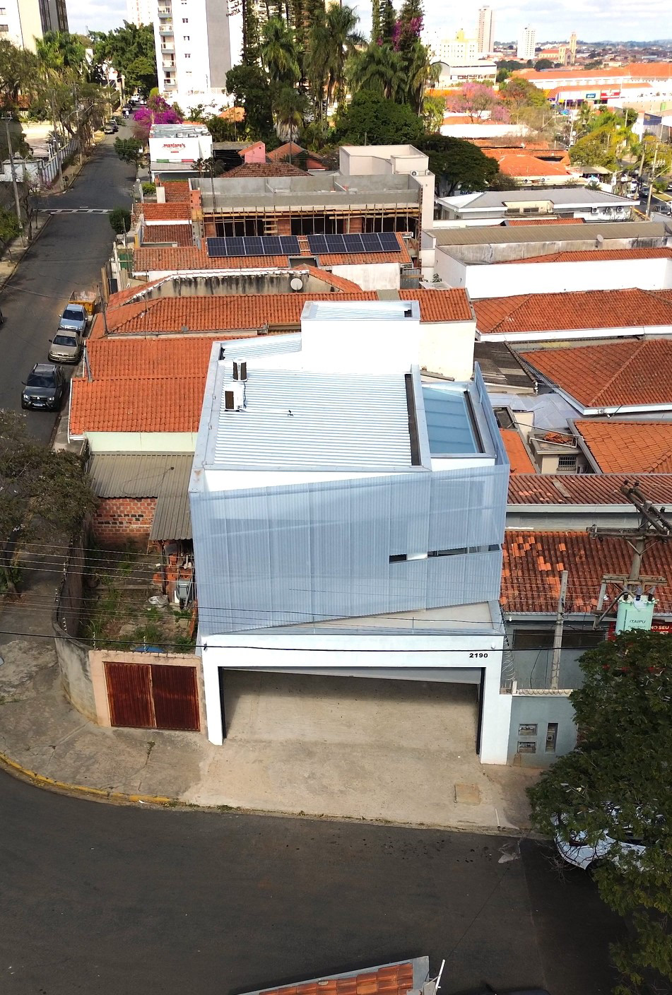 A pele metálica do pavimento superior, levemente torcida, cria um contraste visual com o térreo, com a intenção de atrair olhares de quem passa pela Av. Independência.
