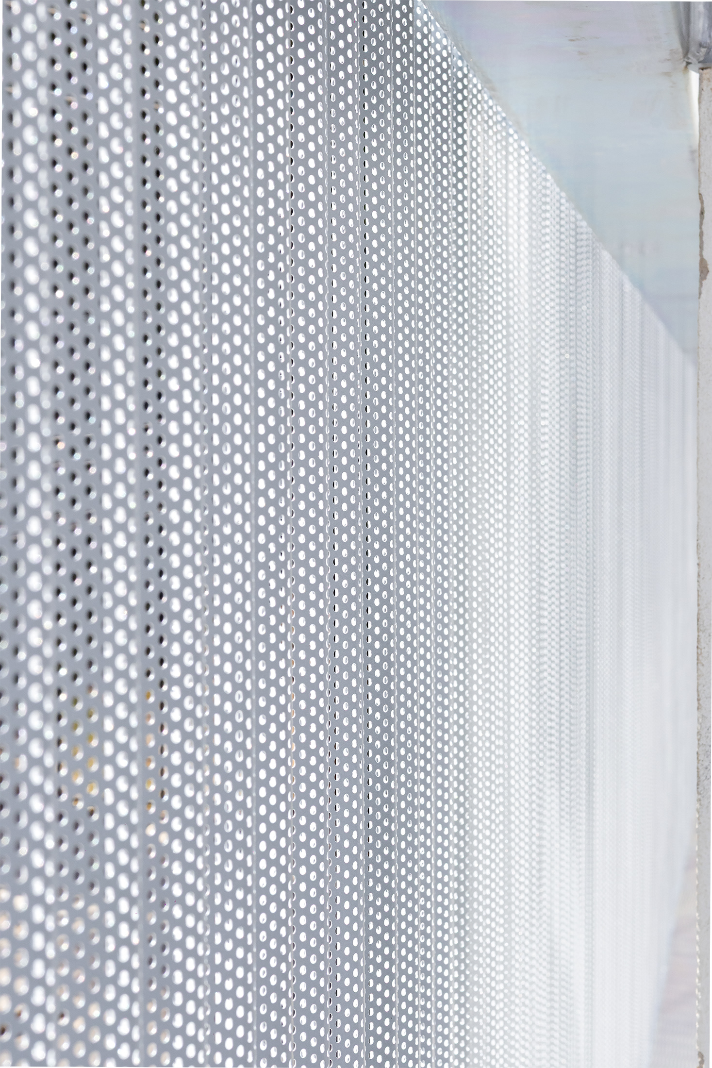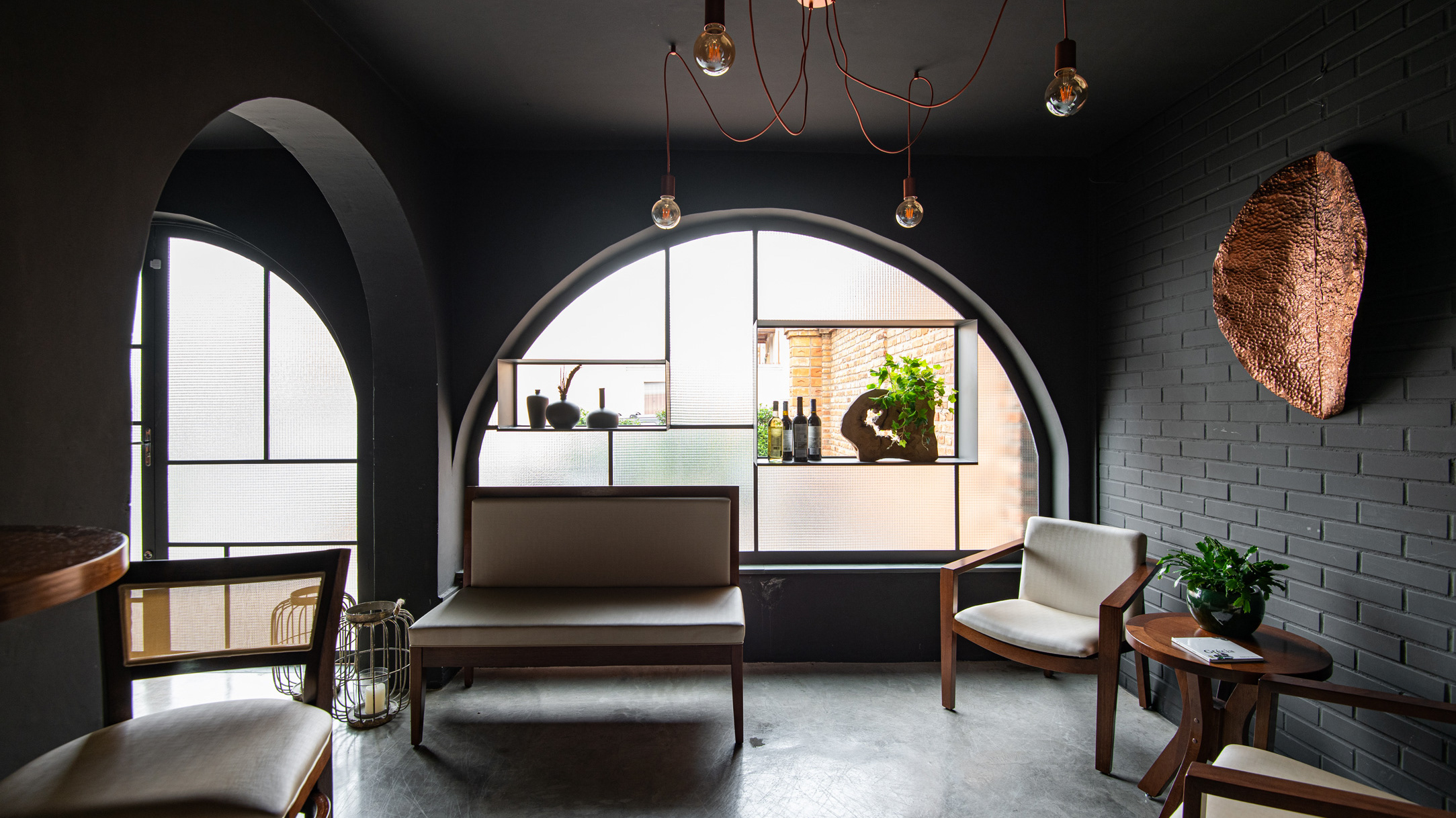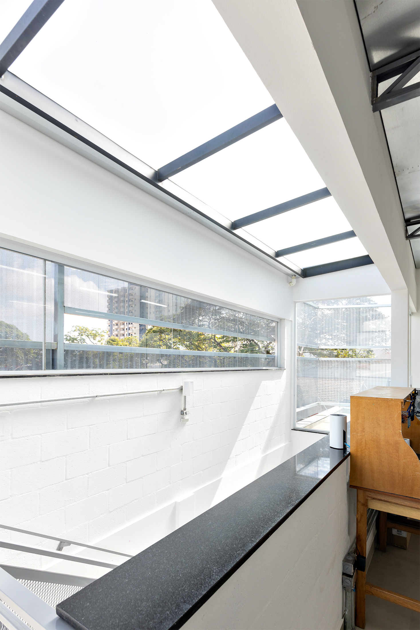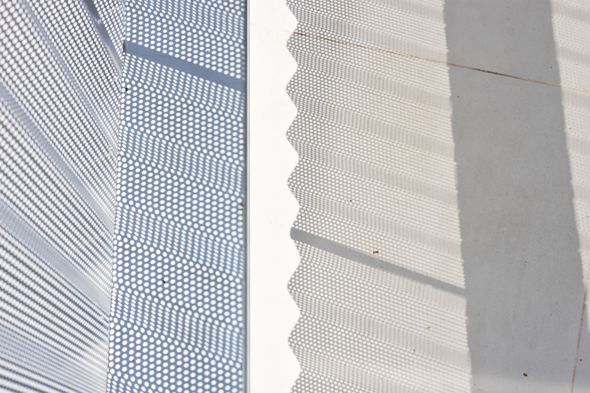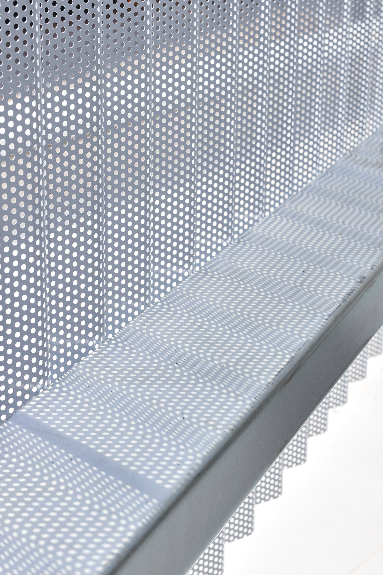 A pele metálica do pavimento superior, levemente torcida, cria um contraste visual com o térreo, com a intenção de atrair olhares de quem passa pela Av. Independência.