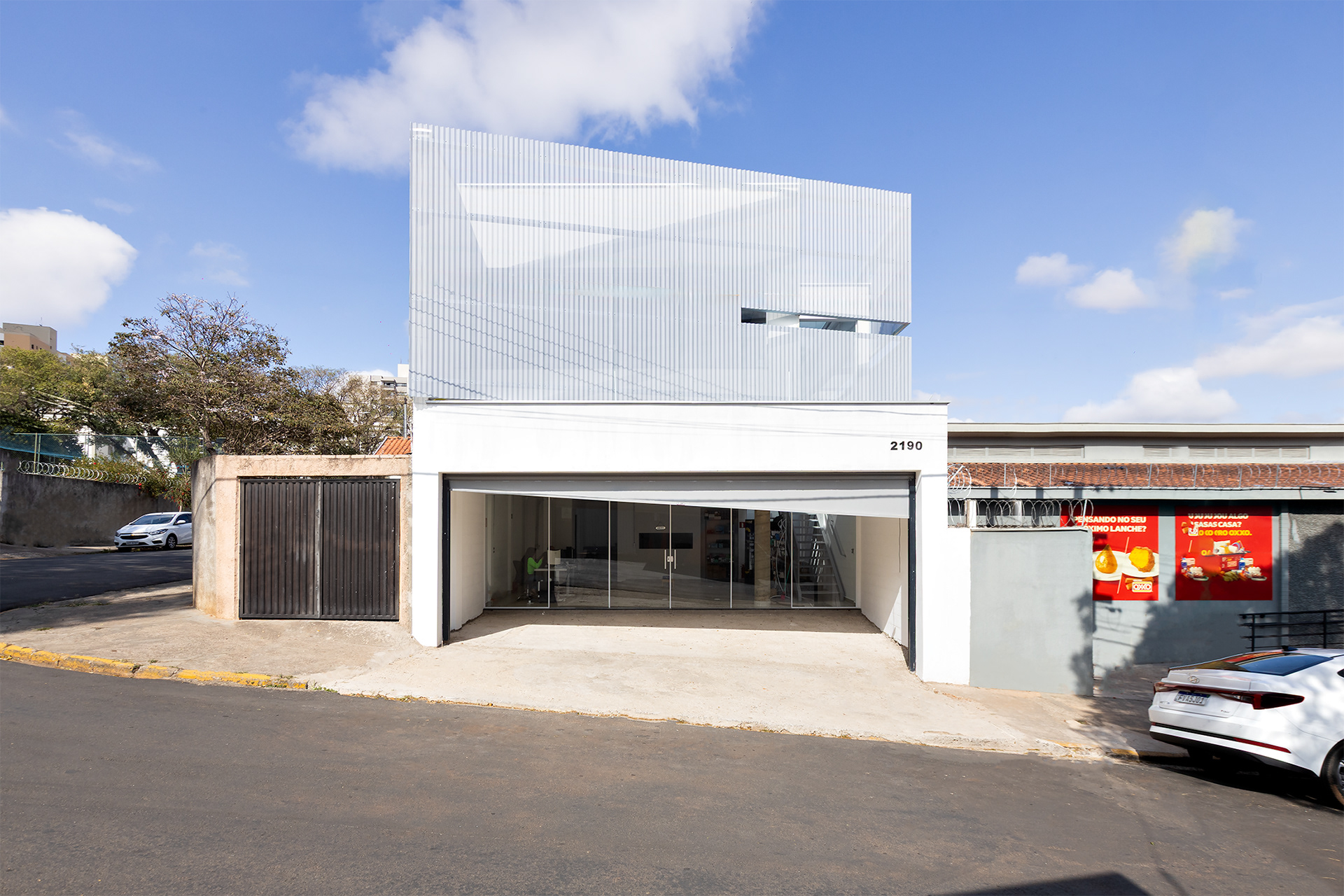 Em um terreno estreito e rua de pouca movimentação, nosso projeto para Papatec, uma loja de informática e manutenção de computadores, se destaca com uma volumetria marcante.