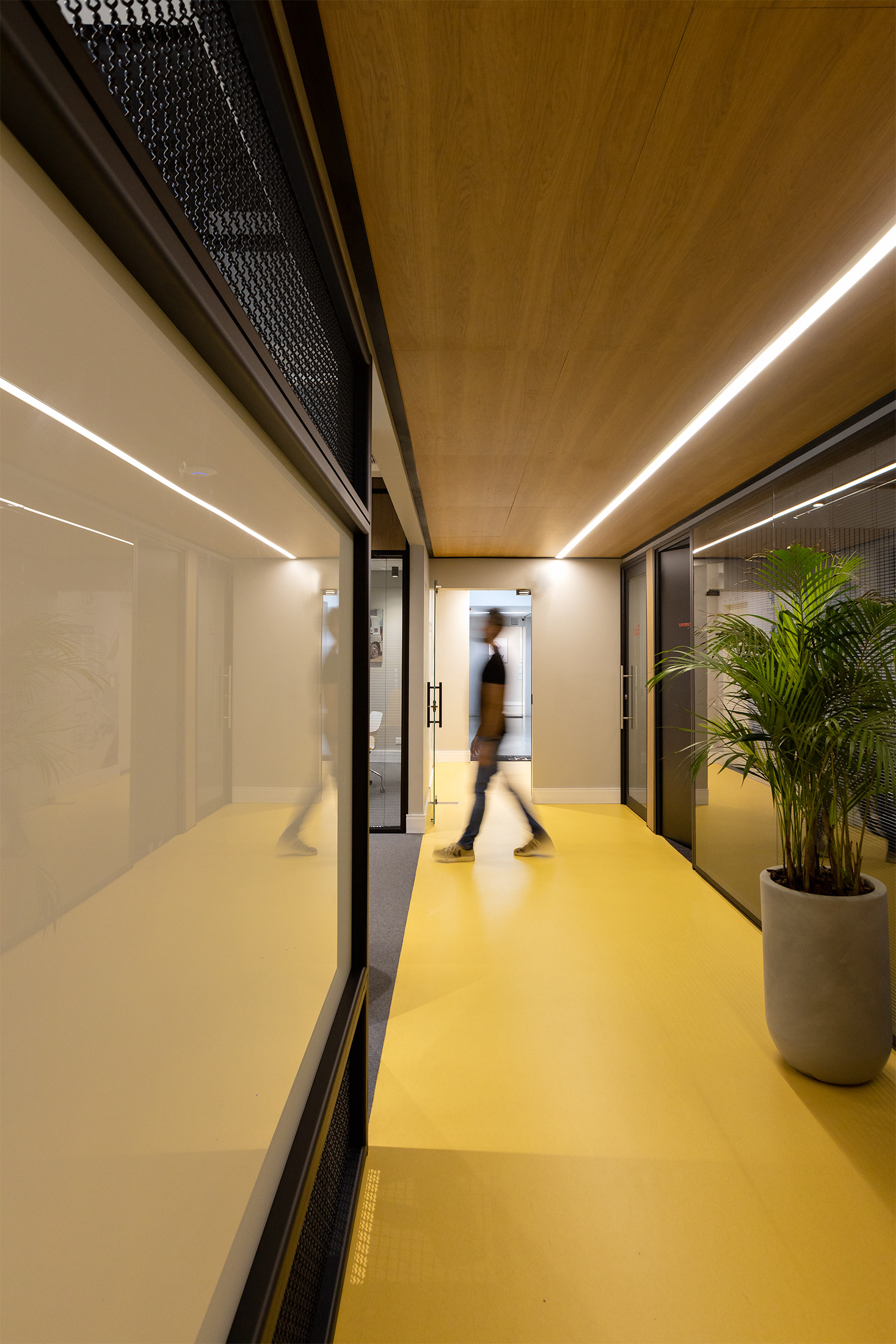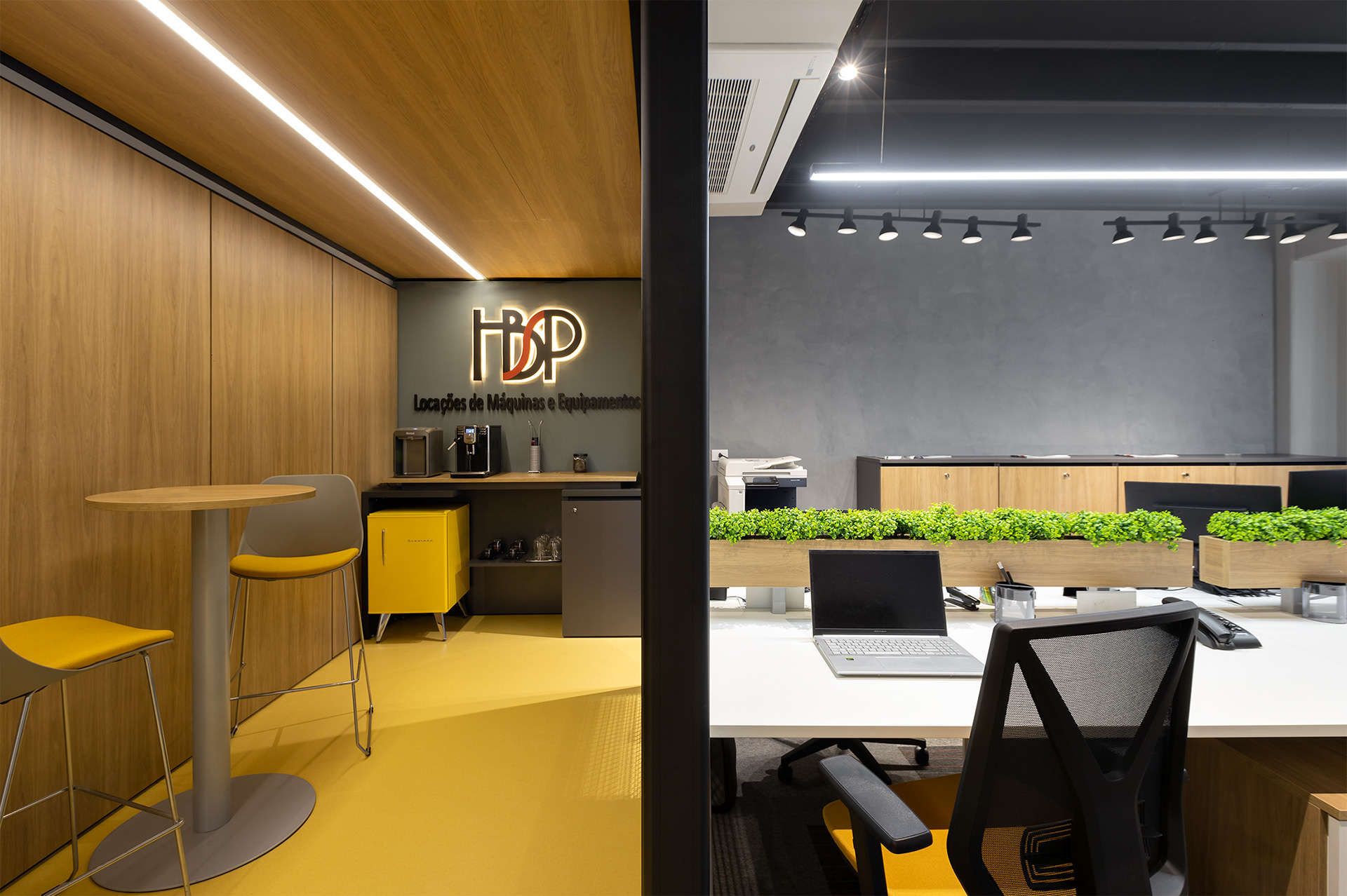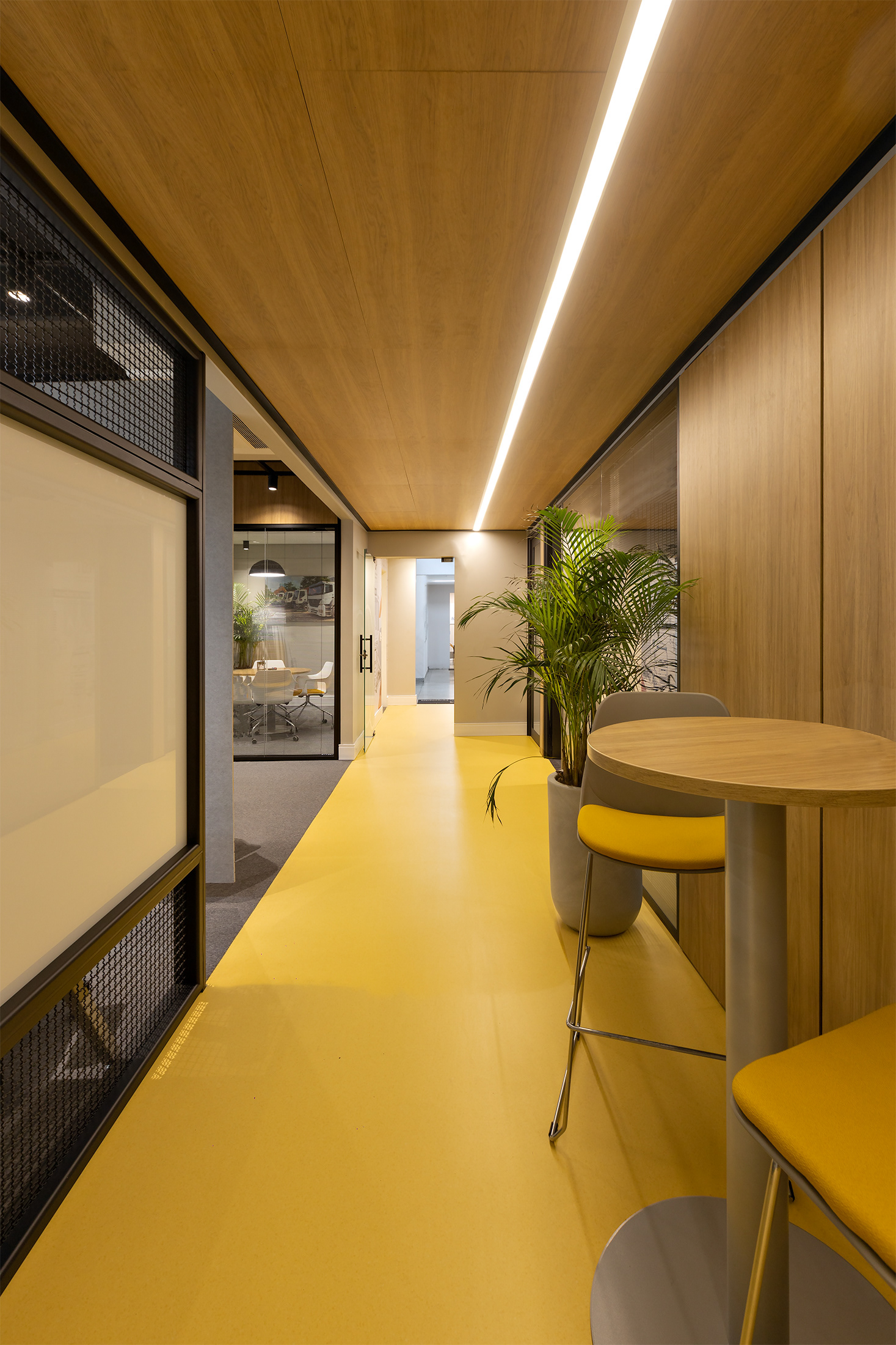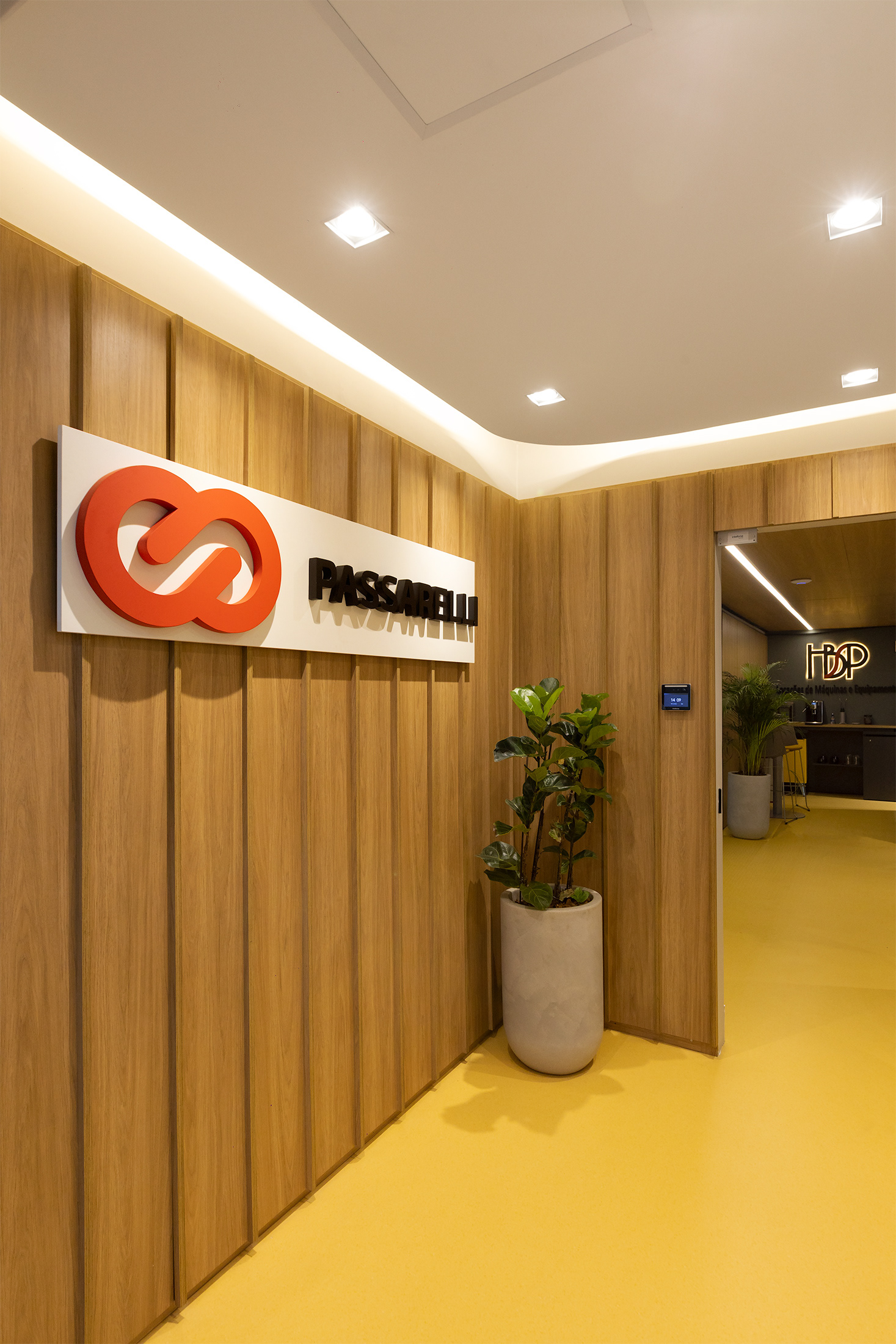 O projeto tirou partido da cor amarela, como um ponto de diferenciação e personalização do espaço, referindo à linha amarela de maquinários: retroescavadeiras, empilhadeiras, tratores, escavadeiras e motoniveladores, inserindo um novo elemento cromático dentro do padrão de comunicação visual da Passarelli que é predominantemente cinza, vermelho e preto. O piso amarelo vinílico cria um contraste interessante com os painéis acústicos de madeira, criando organização espacial a partir de um foco visual para a área de circulação. Demais ambientes possuem o teto alto, onde mantivemos a laje aparente do prédio, pintado-as de preto fosco,.