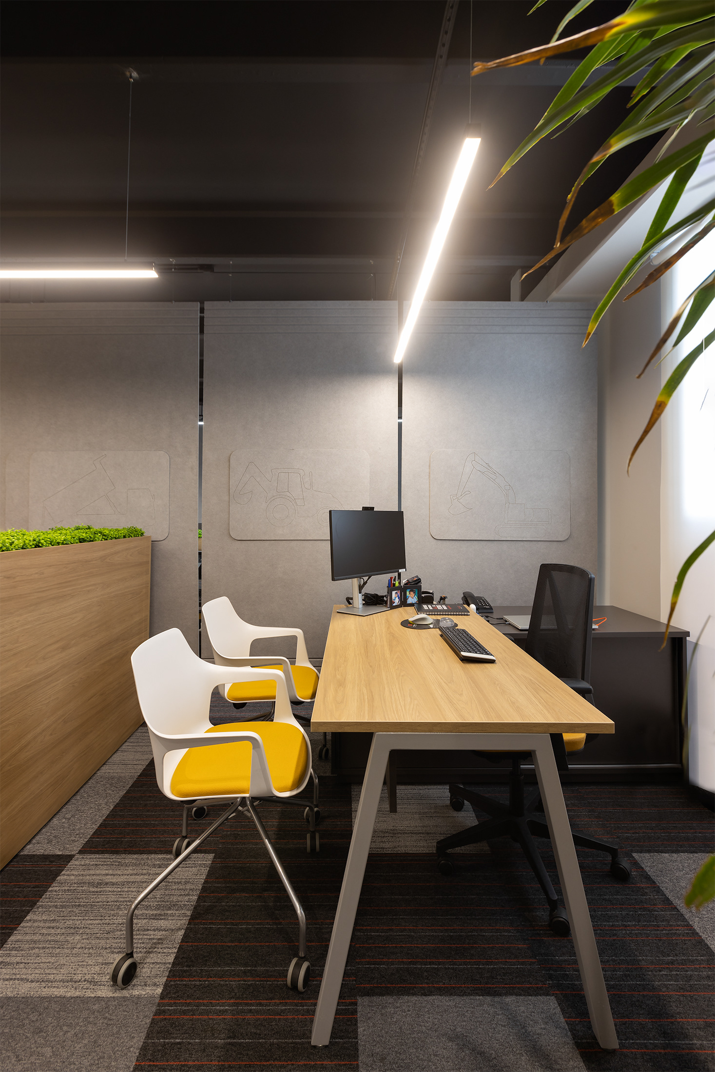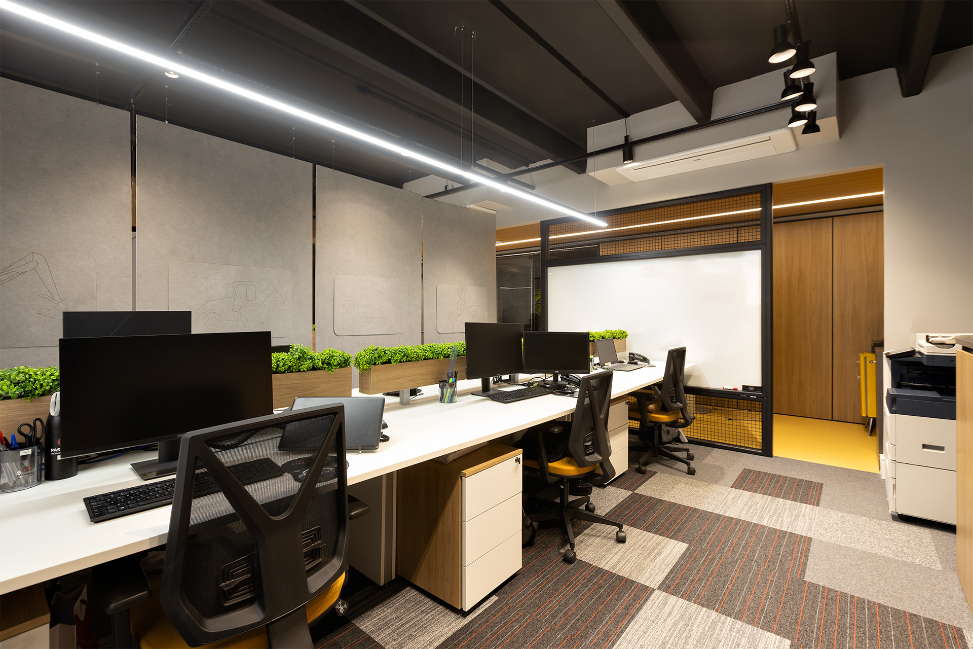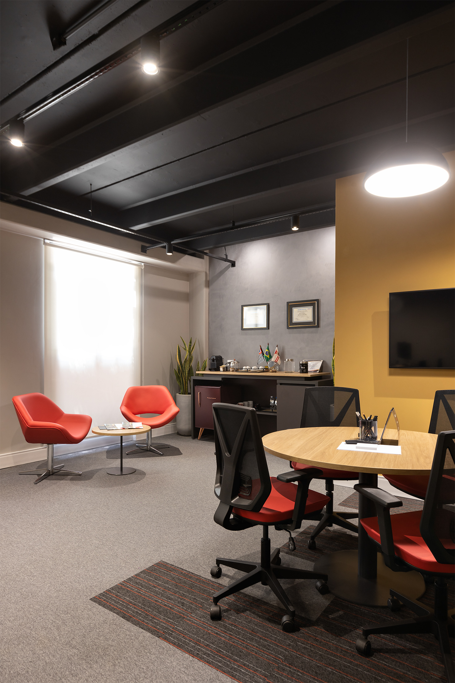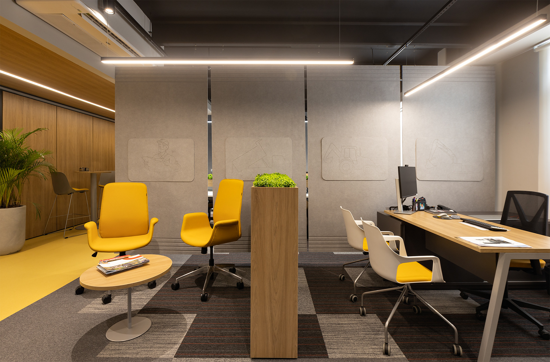 O projeto tirou partido da cor amarela, como um ponto de diferenciação e personalização do espaço, referindo à linha amarela de maquinários: retroescavadeiras, empilhadeiras, tratores, escavadeiras e motoniveladores, inserindo um novo elemento cromático dentro do padrão de comunicação visual da Passarelli que é predominantemente cinza, vermelho e preto. O piso amarelo vinílico cria um contraste interessante com os painéis acústicos de madeira, criando organização espacial a partir de um foco visual para a área de circulação. Demais ambientes possuem o teto alto, onde mantivemos a laje aparente do prédio, pintado-as de preto fosco,.