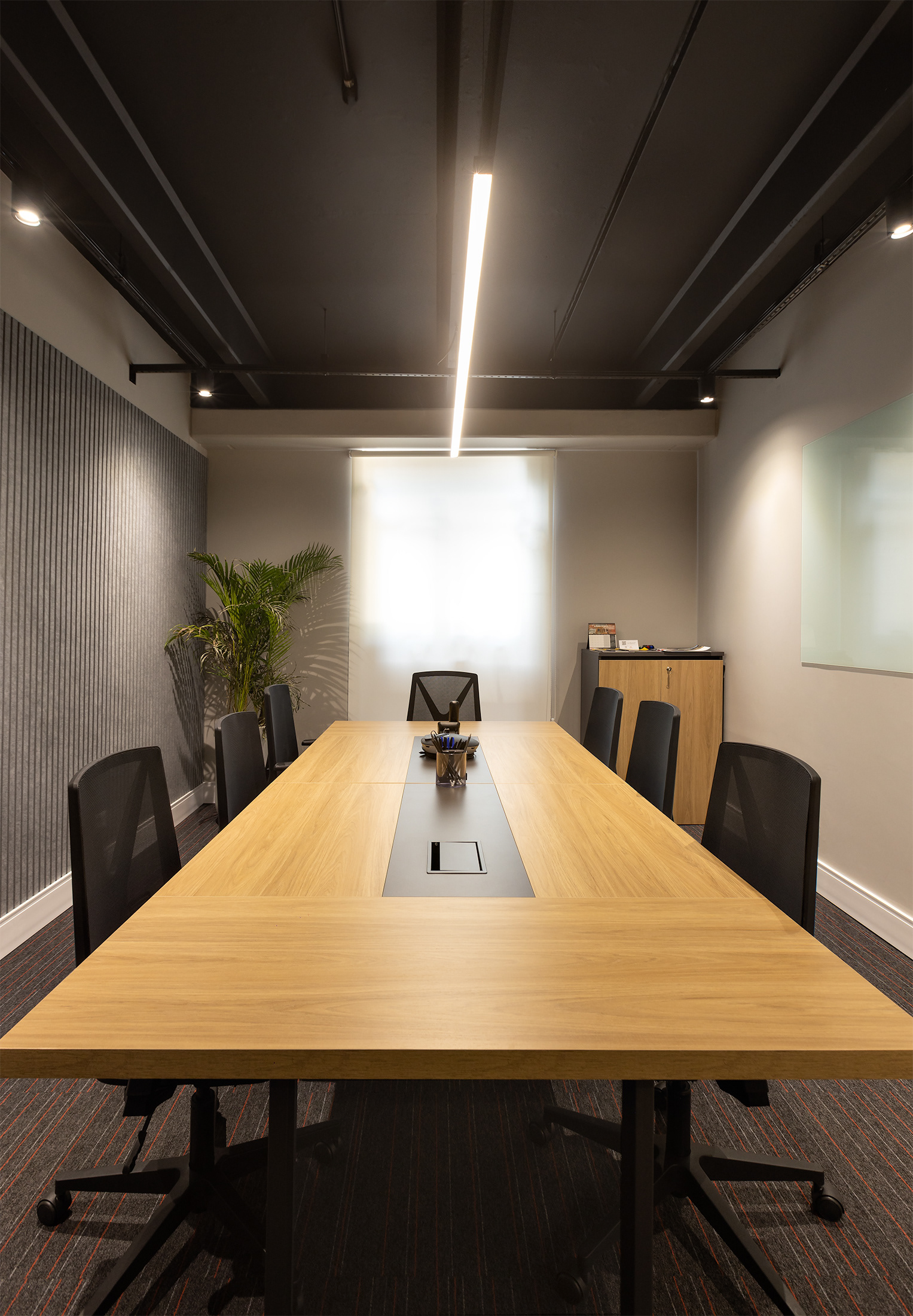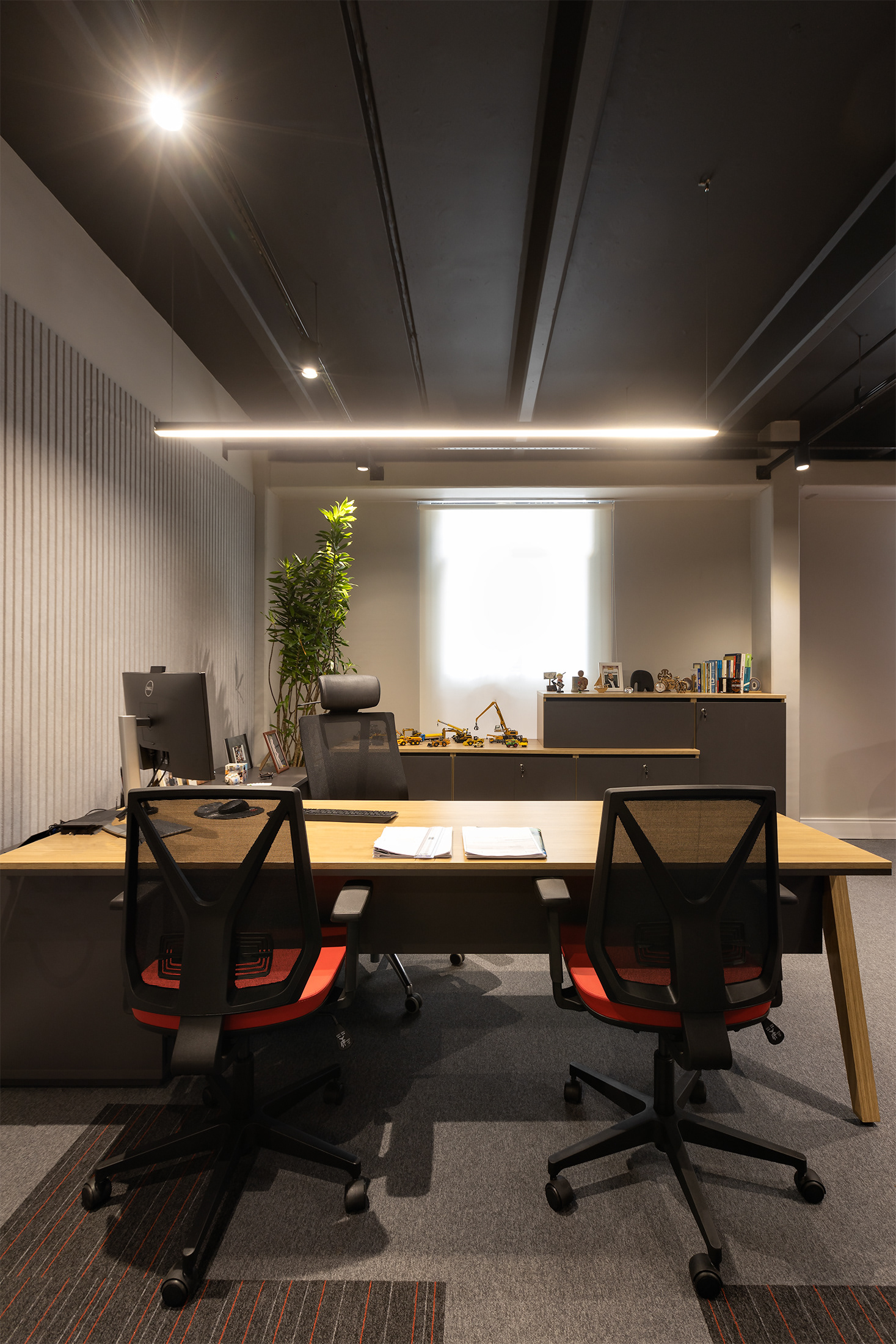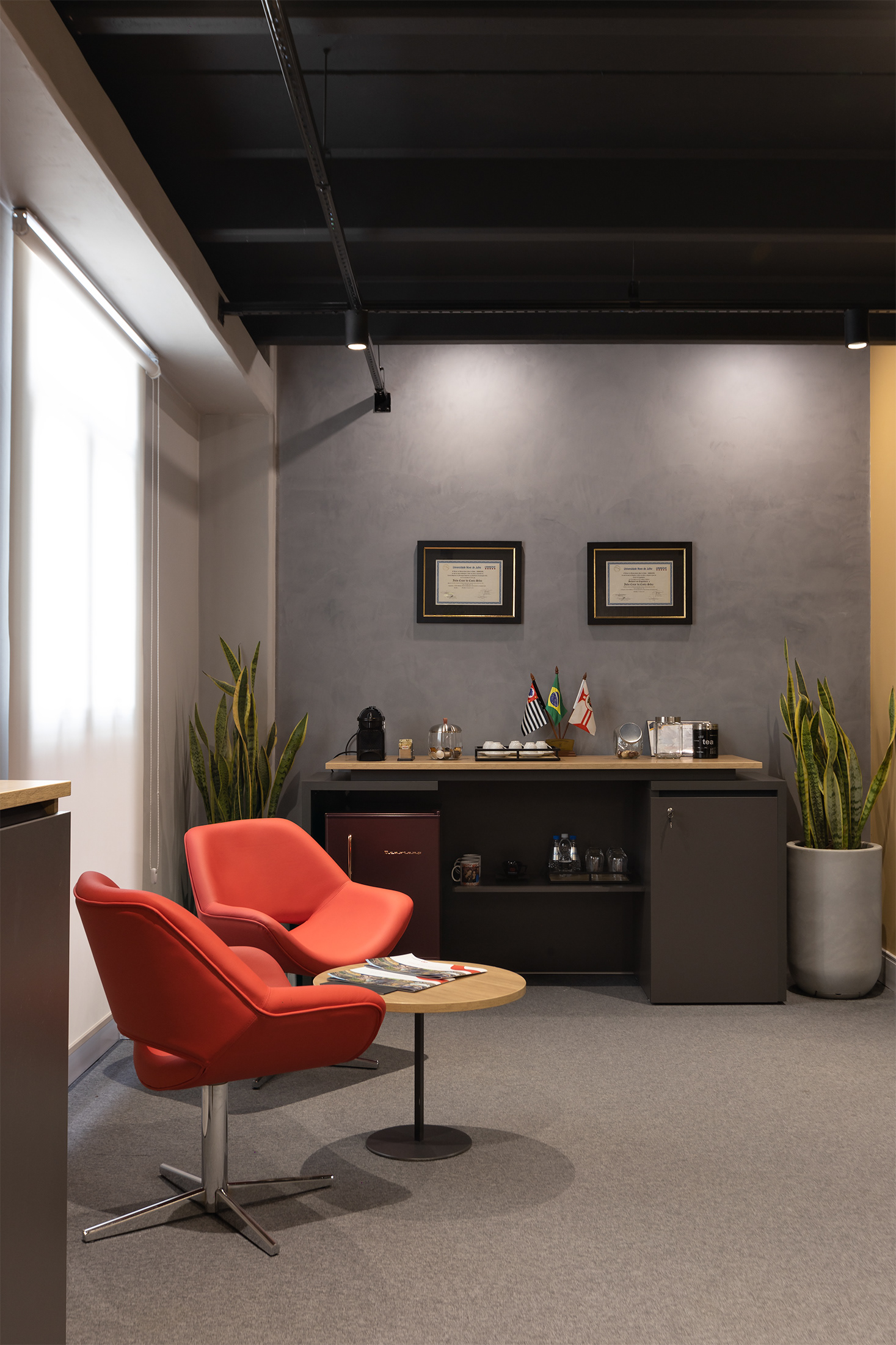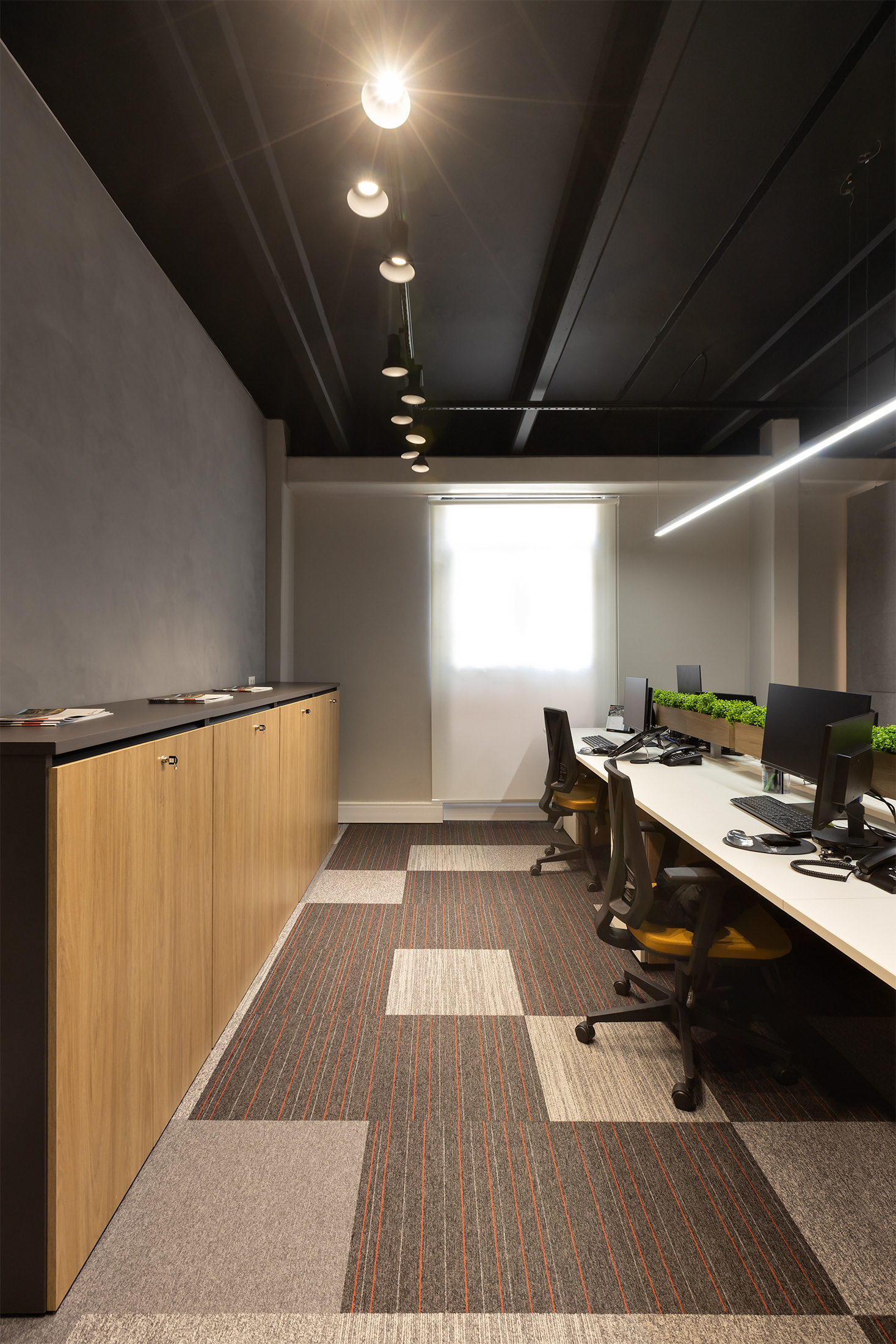 O projeto tirou partido da cor amarela, como um ponto de diferenciação e personalização do espaço, referindo à linha amarela de maquinários: retroescavadeiras, empilhadeiras, tratores, escavadeiras e motoniveladores, inserindo um novo elemento cromático dentro do padrão de comunicação visual da Passarelli que é predominantemente cinza, vermelho e preto. O piso amarelo vinílico cria um contraste interessante com os painéis acústicos de madeira, criando organização espacial a partir de um foco visual para a área de circulação. Demais ambientes possuem o teto alto, onde mantivemos a laje aparente do prédio, pintado-as de preto fosco,.